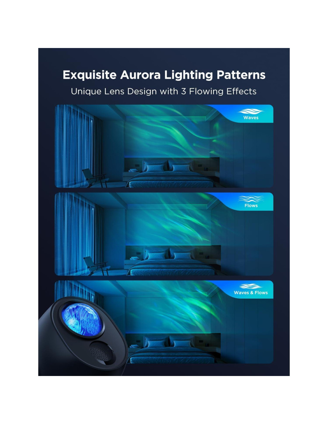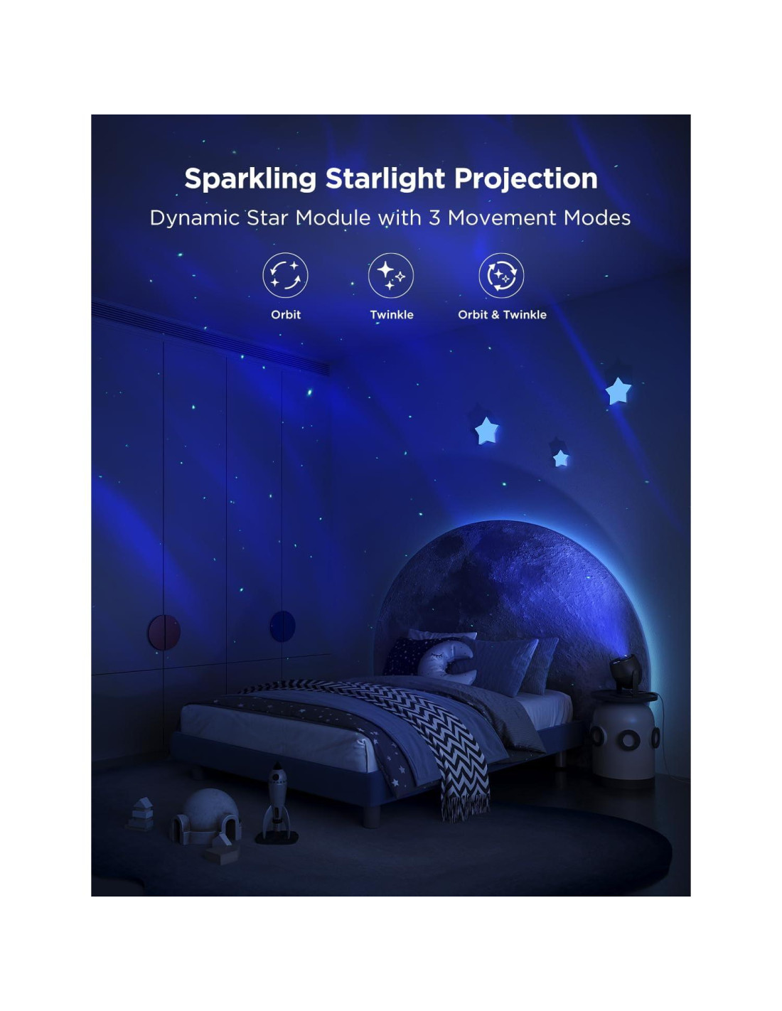 - Realismo de Aurora Mejorado por Perlas de Doble Lámpara: Eleva tu espacio con nuestro proyector de galaxia de perlas LED duales, creando un gran escenario de aurora de 60.39m (650ft). Una lente exclusiva asegura transiciones suaves y luz estelar centelleante con 3 efectos de Flujo de Olas y 3 modos de Estrella en Órbita.