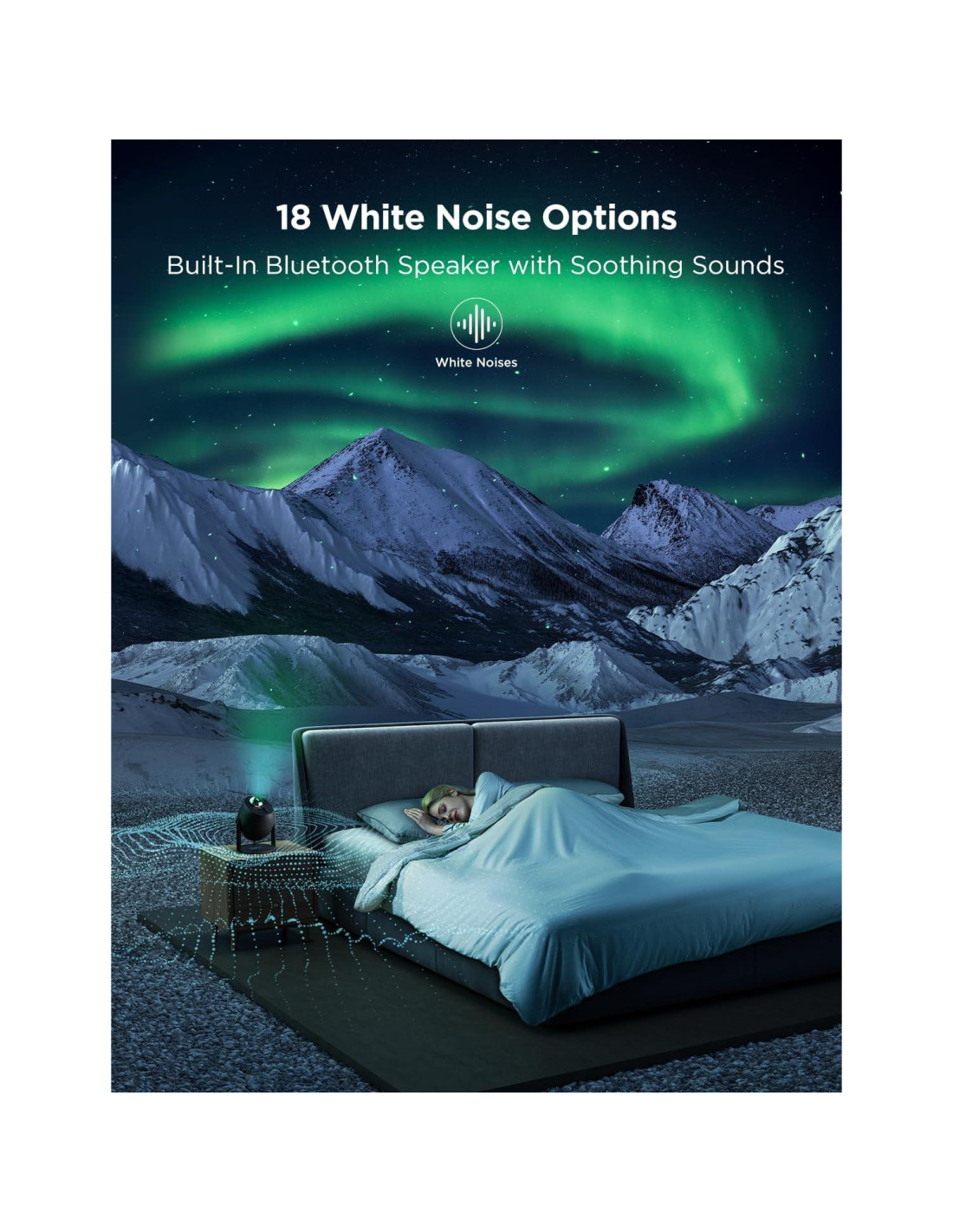- Modos de Escena Diversos: Ofreciendo más de 52 modos de escena y 18 pistas de ruido blanco, y un altavoz Bluetooth incorporado, nuestra luz de proyector de estrellas de dormitorio enriquece cada entorno, ya sea que necesites un fondo tranquilo para dormir o un ambiente romántico.