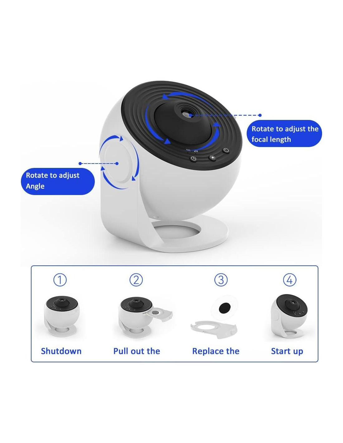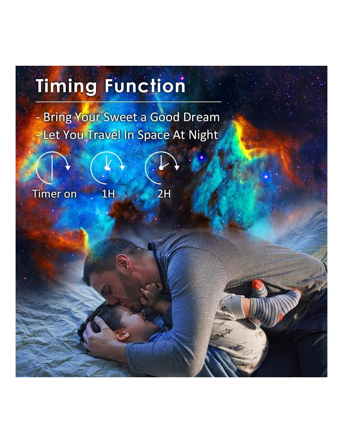 - [Diseño Amigable y Temporizador Automático] Nuestro proyector estelar para dormitorio proporciona un soporte ajustable flexible de 0-360 que aumenta la usabilidad del proyector, por lo que puedes cambiar la proyección entre el techo de la habitación, la pared o cualquier lugar que desees. Con 2 opciones de temporizador automático (1 hora, 2 horas), presiónalo y se apagará automáticamente cuando termine el tiempo, no interrumpirá tu sueño ni el de tu hijo.