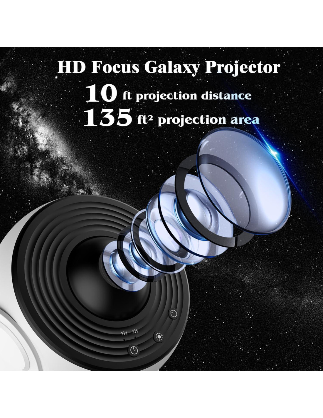 - [Proyector Galáctico HD Realista] Este proyector planetario galáctico HD, gira la perilla de ajuste de enfoque superior para ajustar la longitud focal para una imagen clara. Soporta hasta 3M (9.84 pies) de distancia de proyección y 12.54 m (135 pies cuadrados) de área de proyección. Estrellas esparcidas por la habitación, traen un espectáculo de luces estrelladas mágicas en interiores.