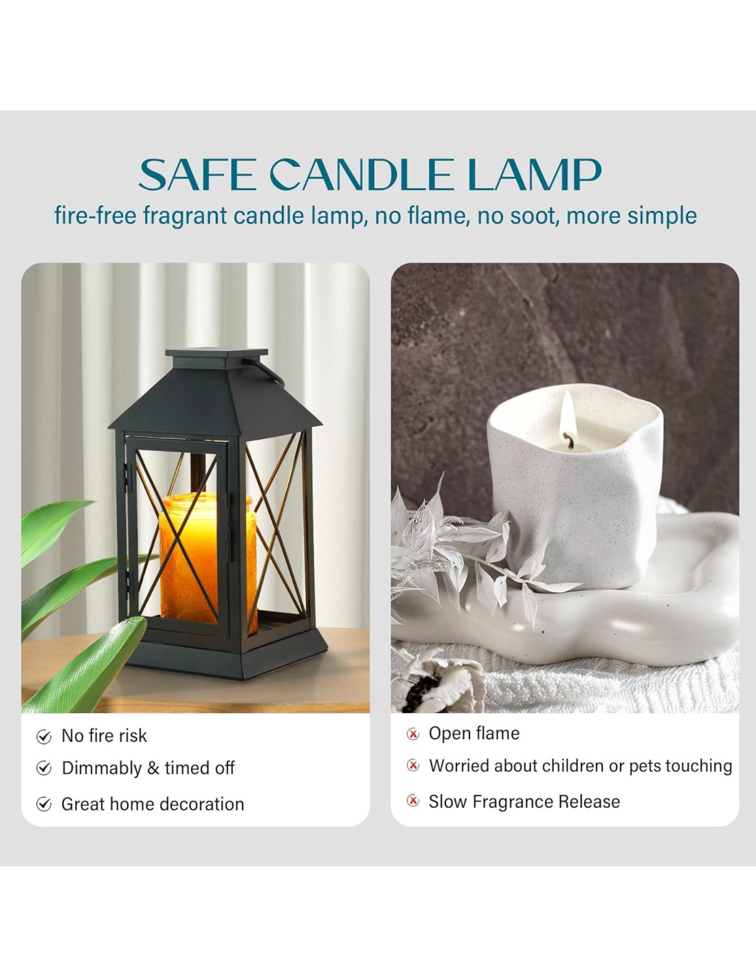 - [Totalmente Cerrado y Colgante] Diseño totalmente cerrado y soporte para colgar lámparas calentadoras de velas, manteniéndolas alejadas de niños y mascotas (perro/gato), para que no te preocupes de que los niños y las mascotas las golpeen. Ideal para familias con niños y mascotas, sin preocuparse por llamas y humo.