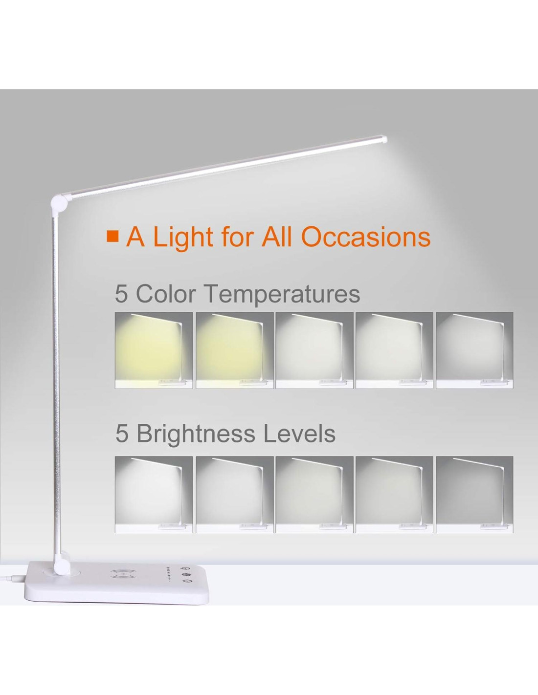- Característica especial: Temporizador automático de 30/60 min, 5 Modos de Iluminación y 5 Brillos, Regulable, Cuidado de los Ojos, Plegable y Portátil, Función de Memoria, Sin Reflejos Deslumbrantes en Pantalla, Puerto de Carga USB, Carga Inalámbrica, Con Enchufe y Adaptador de Pared