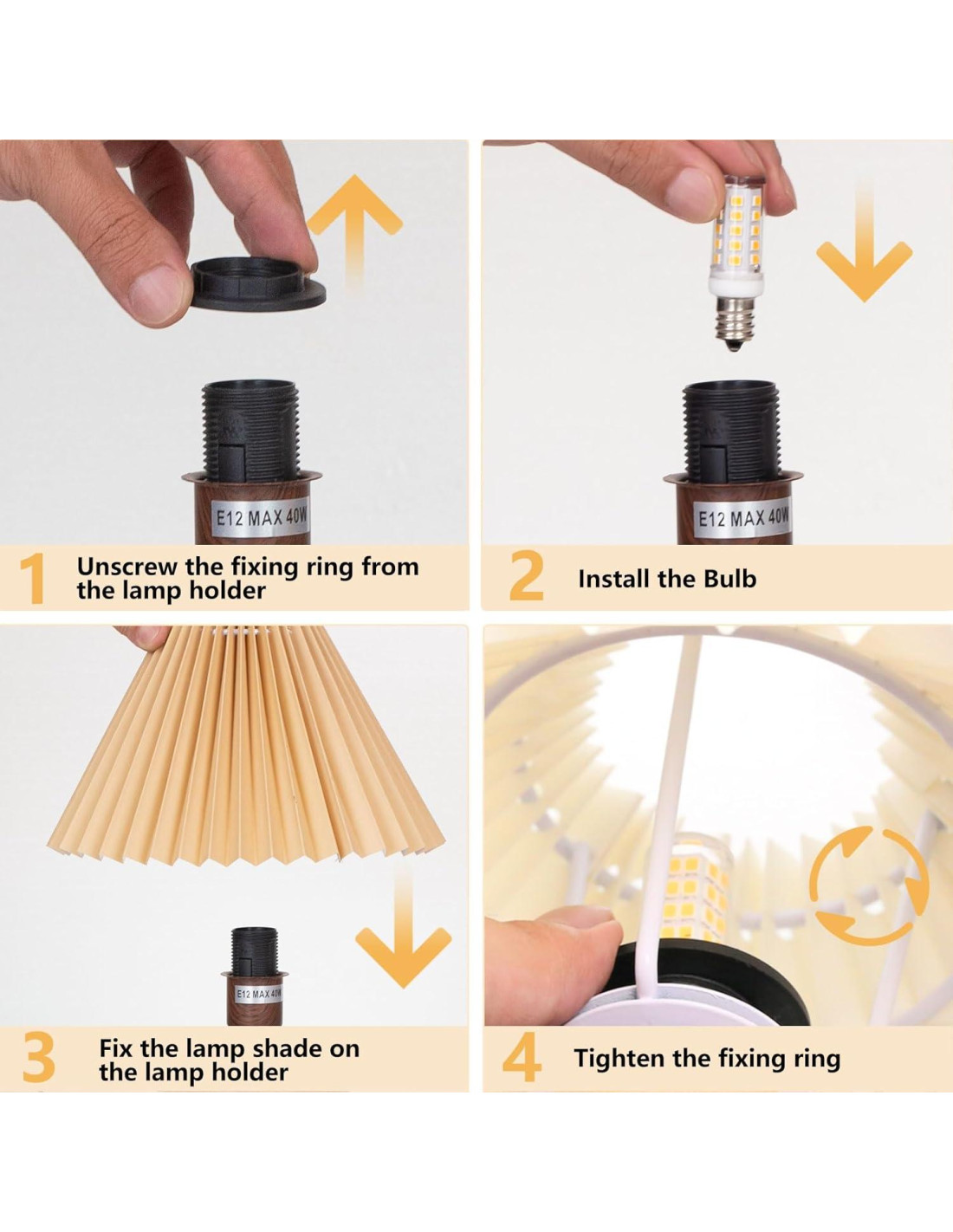- Con bombilla LED E12 de 5W 3000K para esta linda lámpara de escritorio, altura de la lámpara 9.8in (25cm), altura de la pantalla 9.8in (25cm), diámetro de la base de la lámpara 4.7in (12cm), AC: 110-120V, Potencia máxima: 40W, Tipos de bombillas compatibles: LED, CFL, halógena o incandescente.