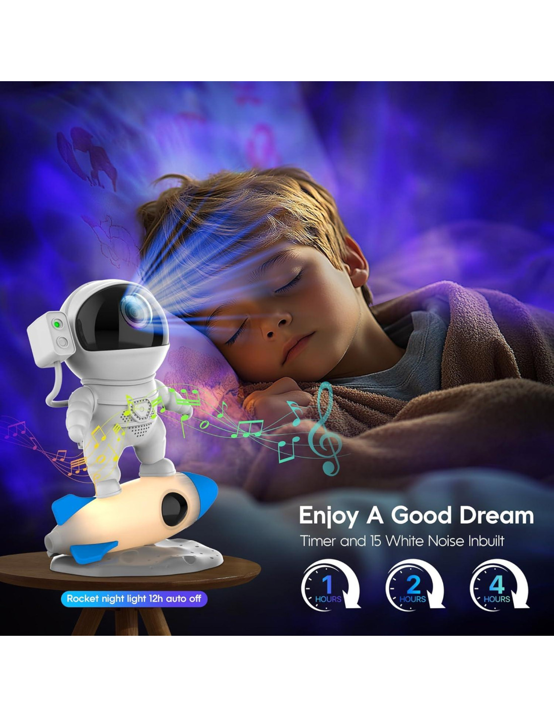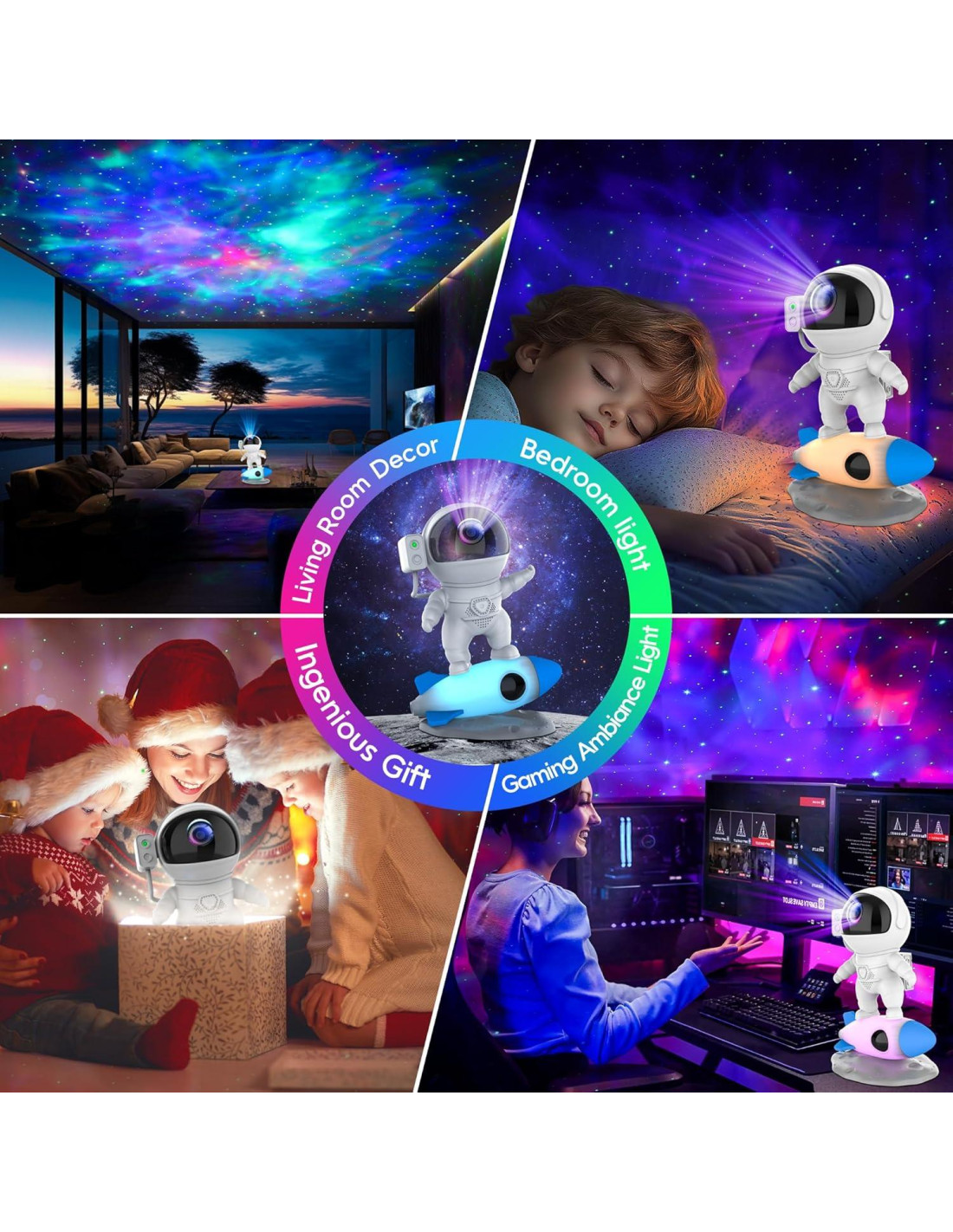 - [4 en 1 Proyector de Luz Nocturna Astronauta Mejorado] - El proyector galáctico combina un proyector, lámpara de luz nocturna, máquina de ruido blanco y altavoz bluetooth todo en un solo dispositivo, lámpara de noche en forma de cohete con 9 colores, el proyector galáctico astronauta combina 10 impresionantes efectos de nebulosa con estrellas verdes centelleantes, proyecta las maravillas de la galaxia en las paredes o el techo de tu habitación, logra 4 niveles de velocidad de flujo y brillo a través del control remoto incluido o la APP.