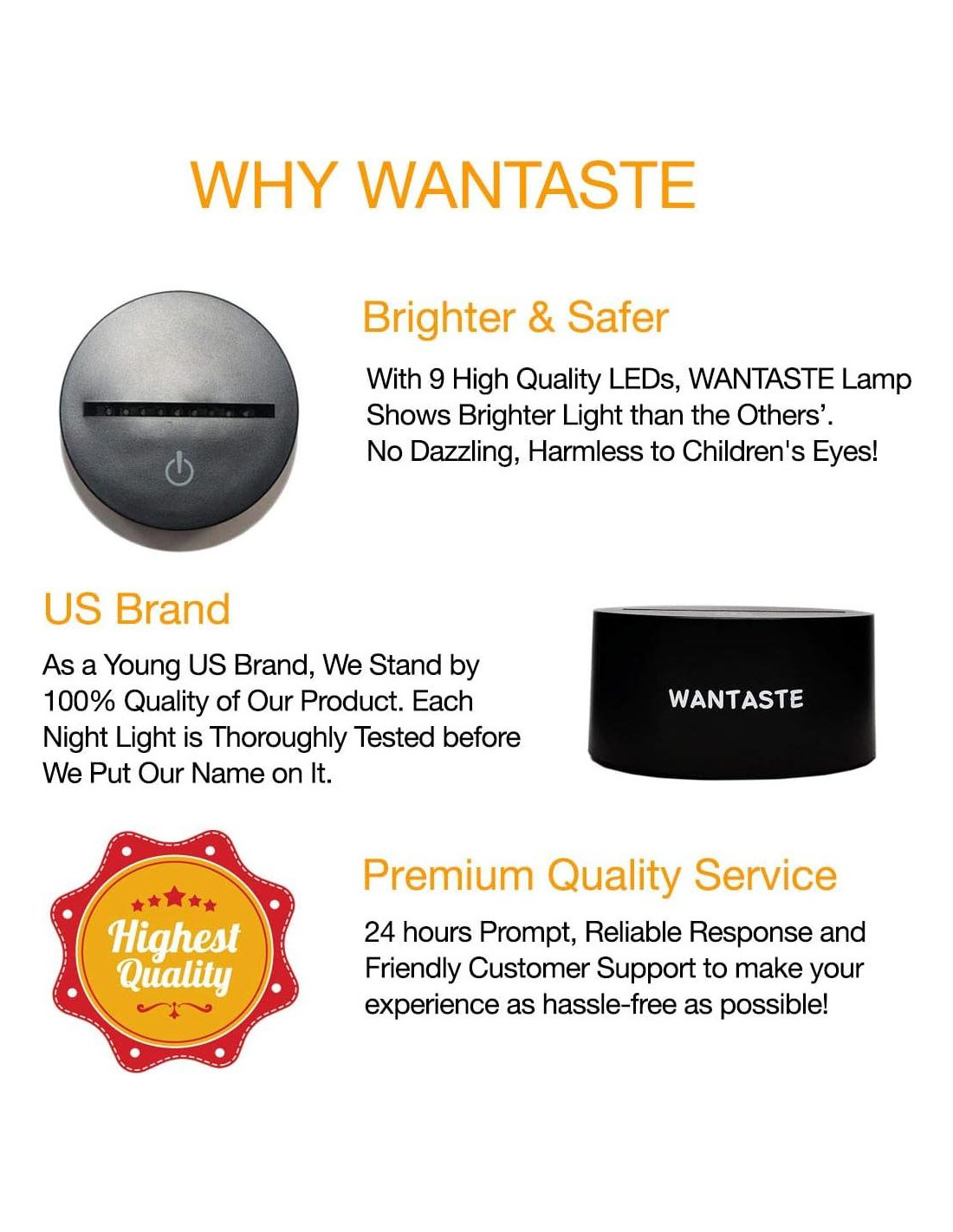 - [Soporte Sin Complicaciones] WANTASTE respalda el 100% de la calidad de nuestra luz nocturna 3D. Respuesta rápida y confiable de 24 horas, y soporte al cliente amigable para hacer que tu experiencia sea lo más libre de complicaciones posible.