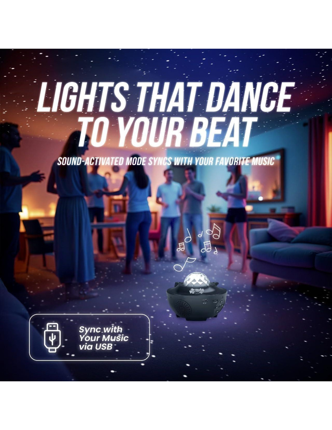 - 4. Modo activado por sonido y temporizador de apagado automático: Para la máxima experiencia de entretenimiento, la luz nocturna proyector galáctico con el modo de ritmo activado por sonido, donde las luces se sincronizan con el ritmo de tu música. Es perfecto para fiestas, añadiendo un emocionante elemento visual a cualquier evento. Además, el temporizador de apagado automático se puede configurar para 1, 2 o 4 horas, facilitando quedarse dormido sin preocuparse por apagarlo manualmente.