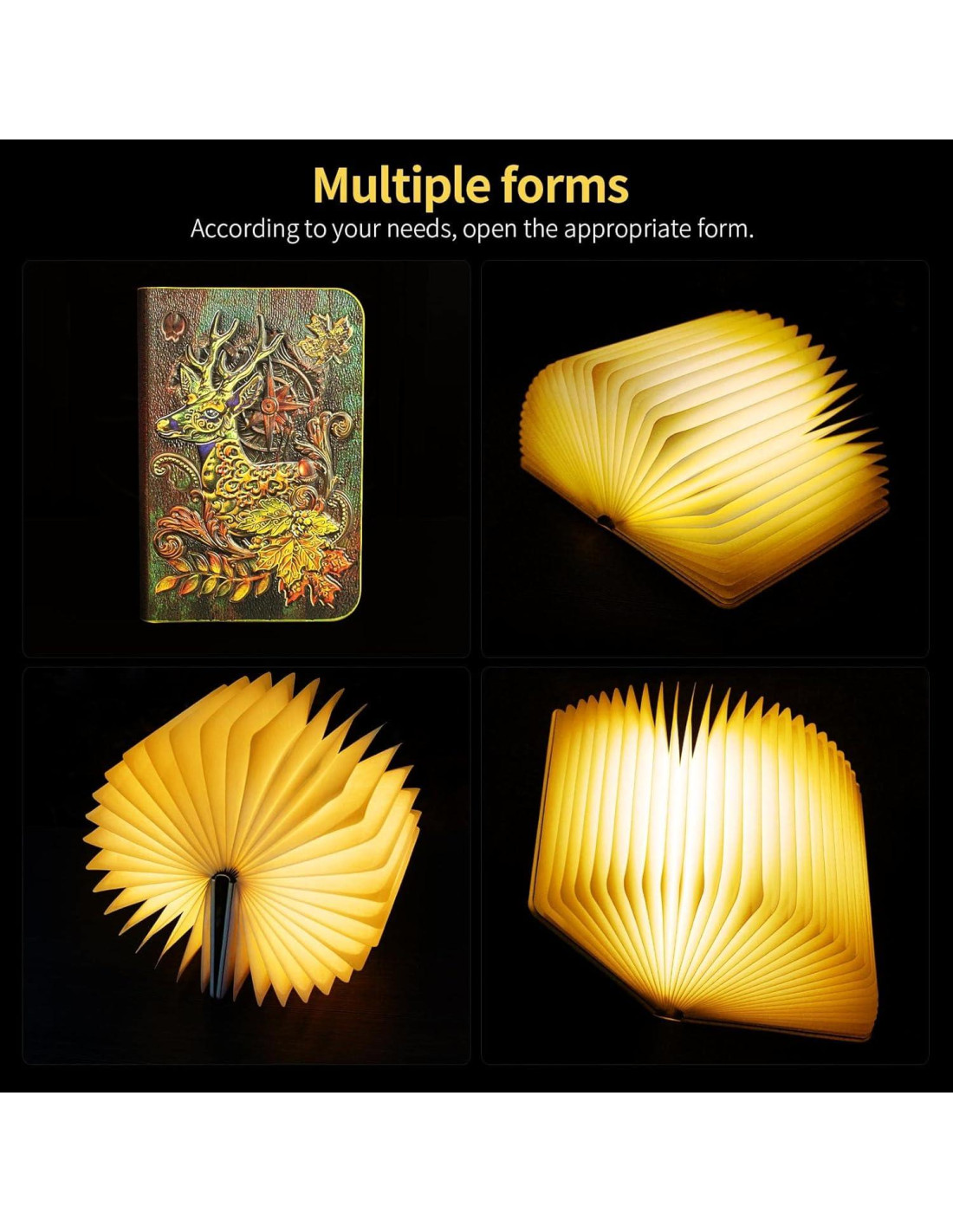 Este será un regalo extraordinario. Regalos para adultos y niños, ya sea un cumpleaños, una festividad o cualquier fiesta. Puedes usarlo en días especiales como el Día del Padre, el Día de la Madre, la Pascua, Halloween, Navidad, Año Nuevo, el Día de Colón, el Día de San Valentín o Acción de Gracias. La lámpara de libro plegable tiene tres colores, uno es el modo de lámpara de respiración. Enciende la lámpara de libro y cierra el libro para apagar la luz. La próxima vez que abras el libro, cambia el color de la luz. El orden de cambio es luz amarilla, luz blanca, luz púrpura y cambio de luz de respiración. Hay cuatro cambios en total. Al usar la nueva lámpara de libro, la flexibilidad de la pantalla de la lámpara compuesta por páginas de libro no se ha expandido completamente. Si necesitas encender la luz horizontalmente a 180 , primero enciende la luz a 360 y mantenla durante más de 2 minutos, para que el libro pueda estar plano. Una pequeña lámpara de libro puede iluminar el entusiasmo de las personas. La luz de página del libro proporciona una buena atmósfera de iluminación para la interacción entre padres e hijos, reuniones de amigos, luces nocturnas, etc. Diseño de libro de arte de ciervo en relieve 3D vintage para decoración de oficina y hogar. Nota especial: Este producto es hecho a mano, y nos esforzaremos por mejorar el producto. Lámpara de libro*1, Caja de regalo*1, Manual*1, Cable de datos*1. La lámpara de libro de ciervo emite luz mágica, fue un regalo para personas que les gusta leer. Los amantes de los libros colocan este increíble regalo en sus escritorios como decoración de libros.