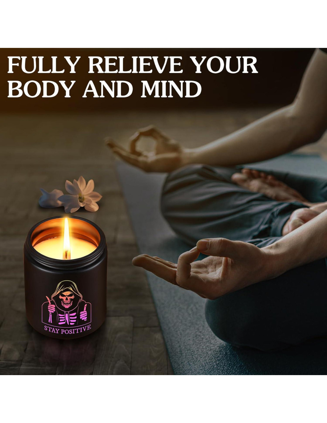 - Hombre Esqueleto Inspirador: La vela de aromaterapia sensible a la luz presenta un diseño de hombre esqueleto inspirador con las palabras 'MANTENTE POSITIVO', el elegante diseño negro, patrones exquisitos y lenguaje interesante hacen que esta vela aromática sea aún más única y adecuada para cualquier hombre que merezca elegancia
