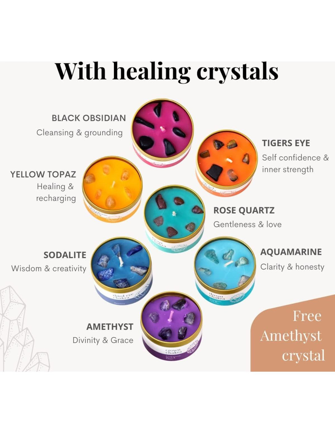 - Juego de Siete Velas de Lujo - Una vela para cada uno de los chakras, hemos seleccionado cuidadosamente piedras preciosas y cristales genuinos para mejorar la energía de cada vela. Potencia tu espiritualidad y amplifica tu abundancia y riqueza.