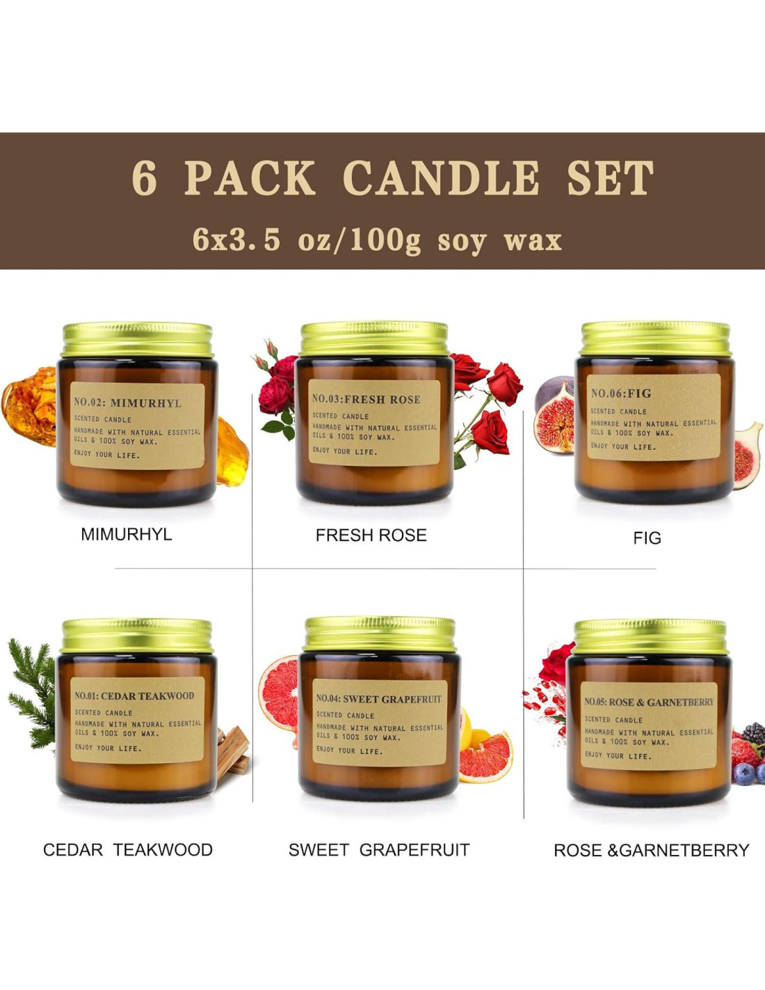 - VELA DE AROMATERAPIA: Las fragancias más pesadas y ricas incluyen Mimurhyl + Rosa Fresca + Madera de Cedro + Pomelo Dulce + Rosa y Garnetberry + Higo. Cuando enciendes la vela, es fácil volver a la antigua casa de madera en el siglo XIX y sentir una sensación de vida muy terrenal. Las velas son maravillosos aromas familiares que traen un efecto relajante y calmante.