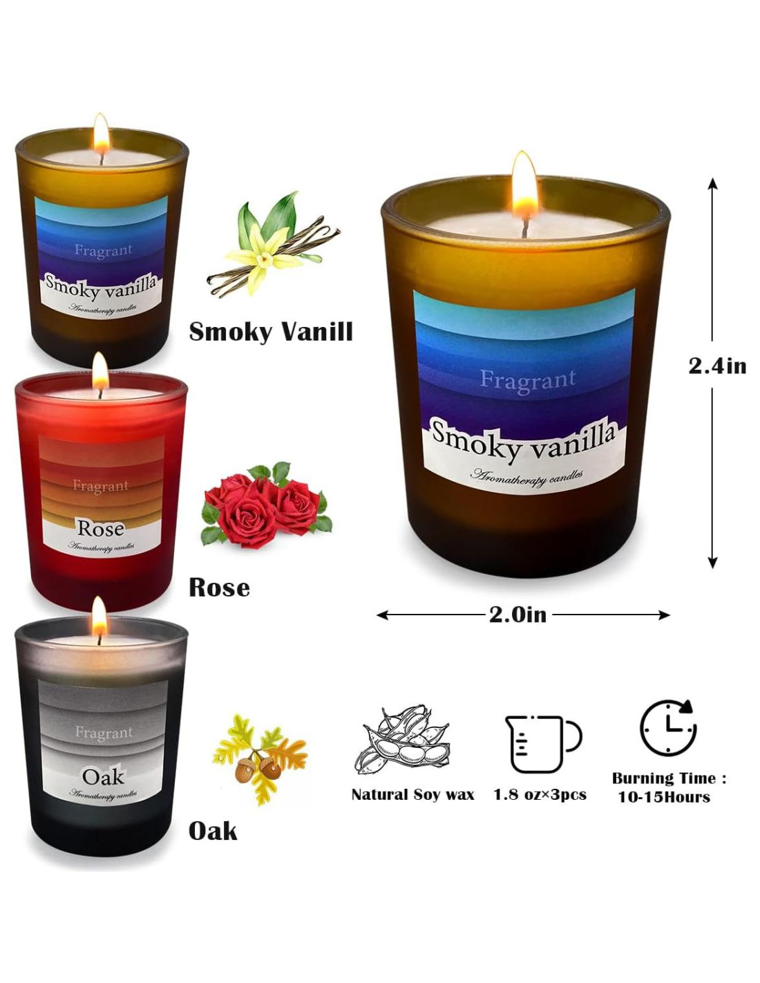 - Tres Aromas Lujosos: Este conjunto incluye tres fragancias únicas: Vainilla Ahumada, Rosa y Roble. Cada vela está diseñada para crear una atmósfera tranquila y acogedora, perfecta para la relajación, la meditación o para realzar la decoración de tu hogar.