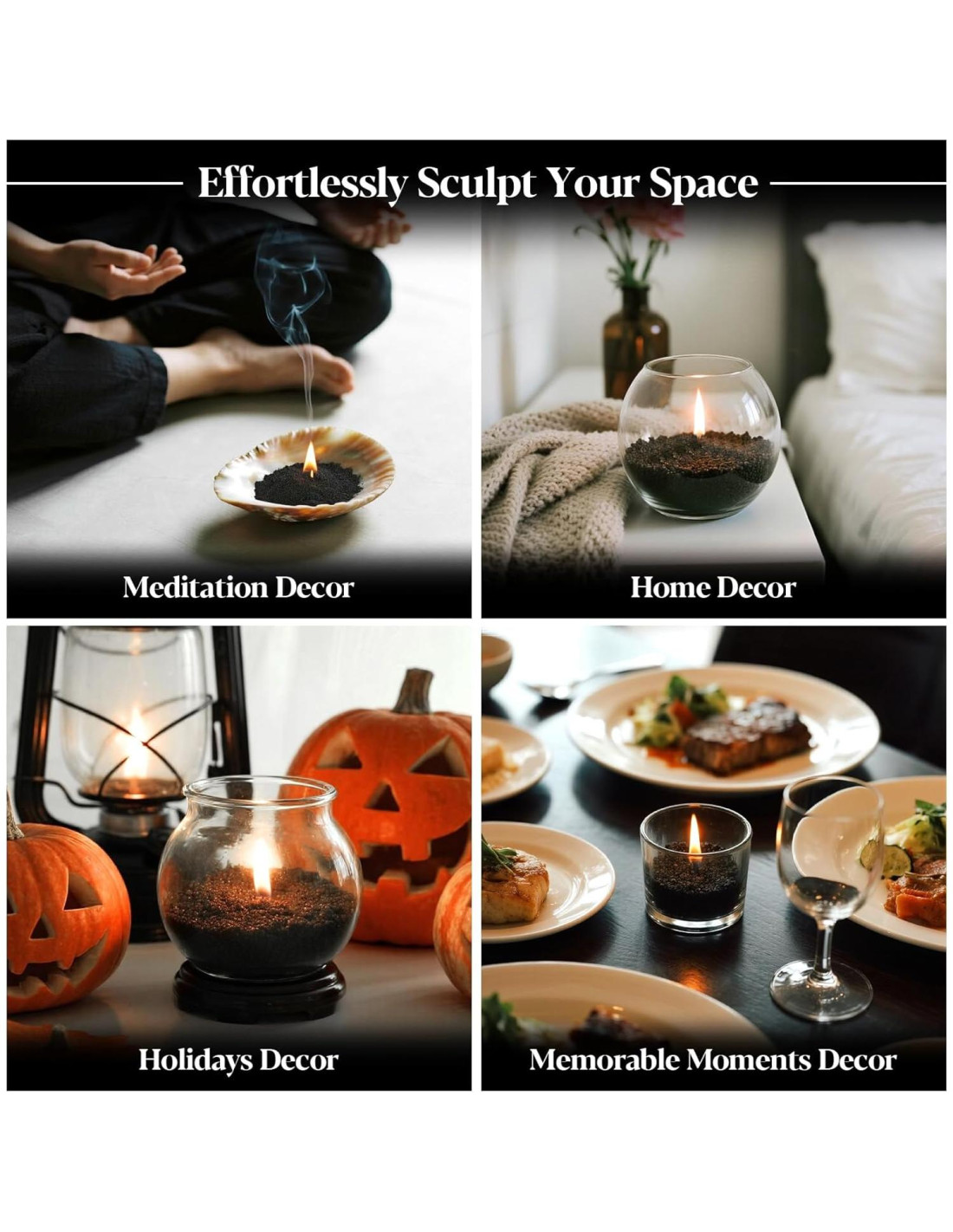 - Textura de Arena Suave: Nuestra mezcla de cera única crea granos ultra-finos, similares a la arena, con un brillo negro. Estas velas de arena negra con mechas son perfectas para una decoración del hogar sofisticada, ambiente de cumpleaños, o para crear cualquier entorno de lujo con su impactante elegancia oscura.