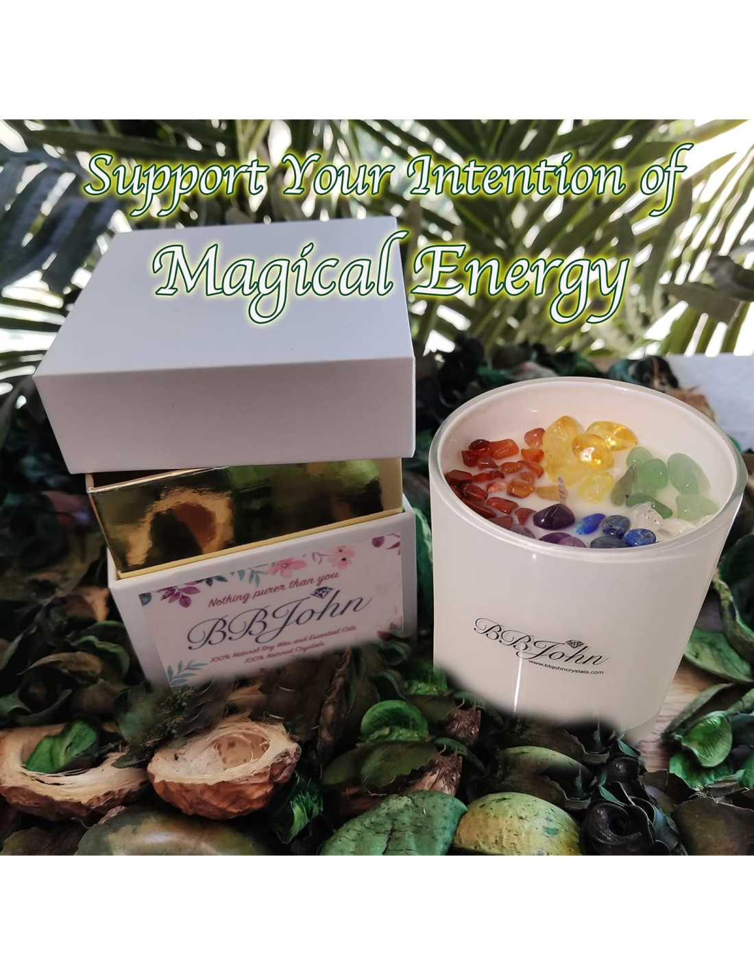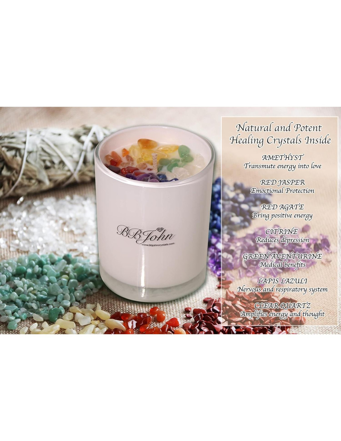 - ALTA CALIDAD Y ECOLÓGICA: Nuestra lujosa vela de cristal de 7 chakras de BBJohn está hecha con 100% cera de soja pura y una mecha de algodón sin plomo, proporcionando una combustión más limpia y duradera. Están infusionadas con fragancias naturales de grado premium: "Brisa del Océano", y no contienen colorantes ni parafina