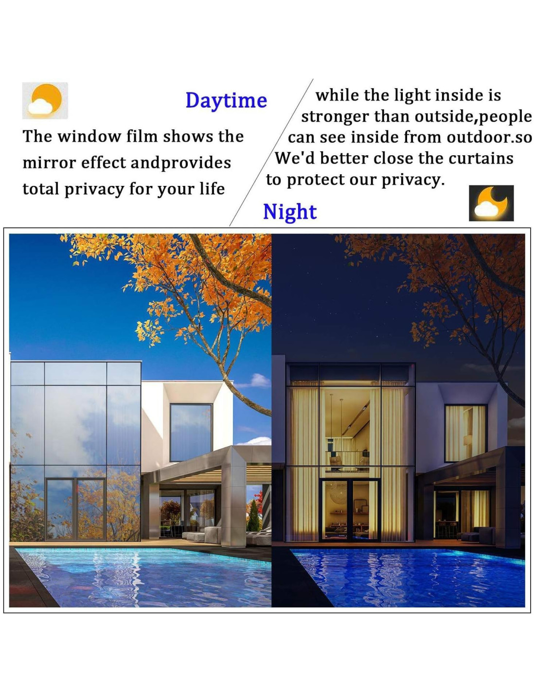 - [PROTECCIÓN DE PRIVACIDAD DIURNA] Aplicar nuestra película de ventana a tus ventanas evita que miradas curiosas entren durante el día mientras deja entrar luz natural, y el vidrio exterior muestra un efecto reflectante de espejo. AVISO: Cuando la luz interior es más fuerte que la exterior por la noche, la película NO PUEDE proporcionar privacidad, y el efecto reflectante de espejo desaparecerá. Recuerda cerrar las cortinas por la noche.