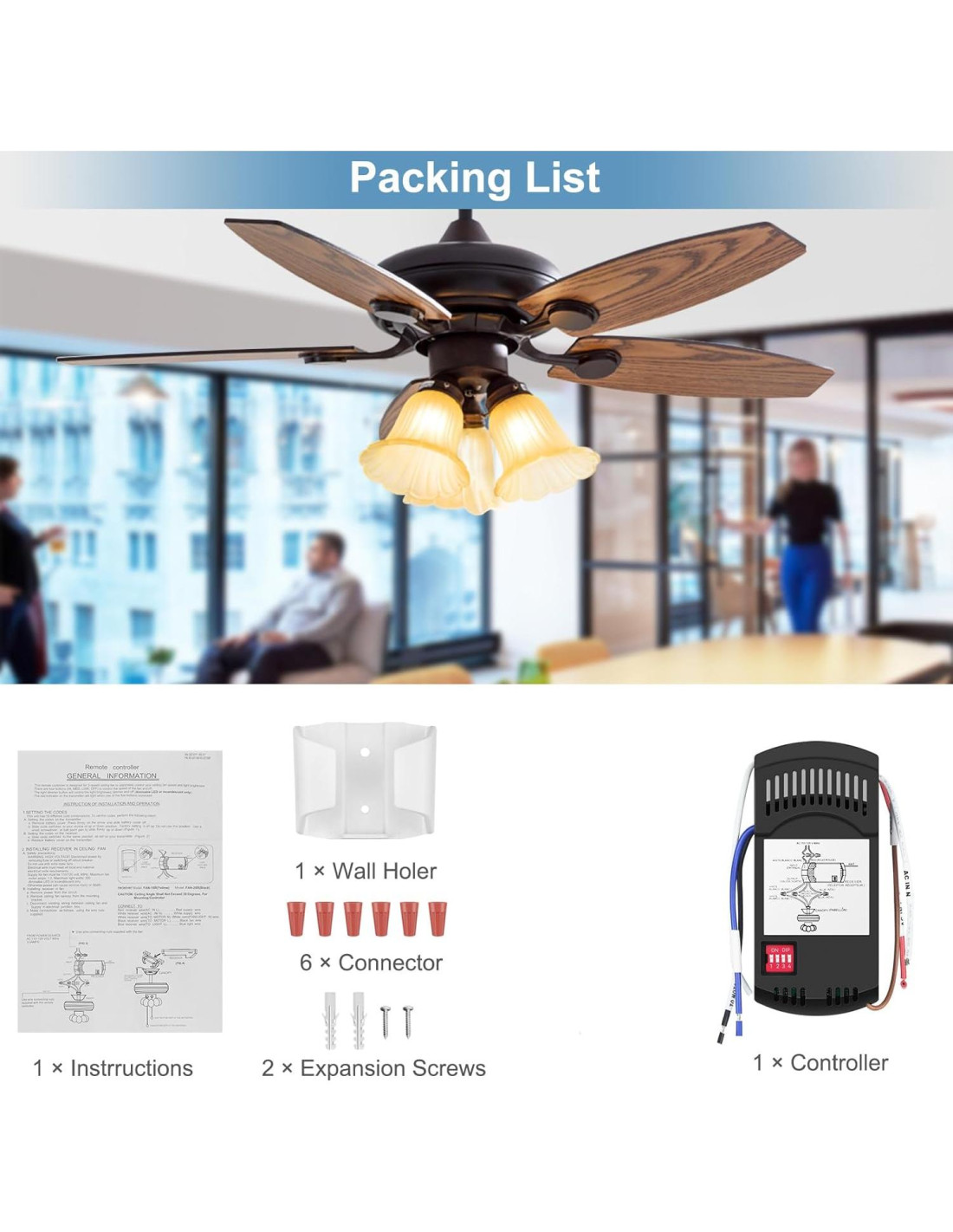 - Especificaciones y paquete Este es solo un receptor con 4 interruptores DIP para control remoto de ventilador de techo. RF es 303.9MHz. La alimentación para el ventilador debe ser de 110/120 voltios, 60Hz. Máxima corriente del motor del ventilador: 1.0, Máxima potencia de luz: 240w. Contenido del paquete incluye receptor *1, tuercas de cable *6, guía del usuario *1.