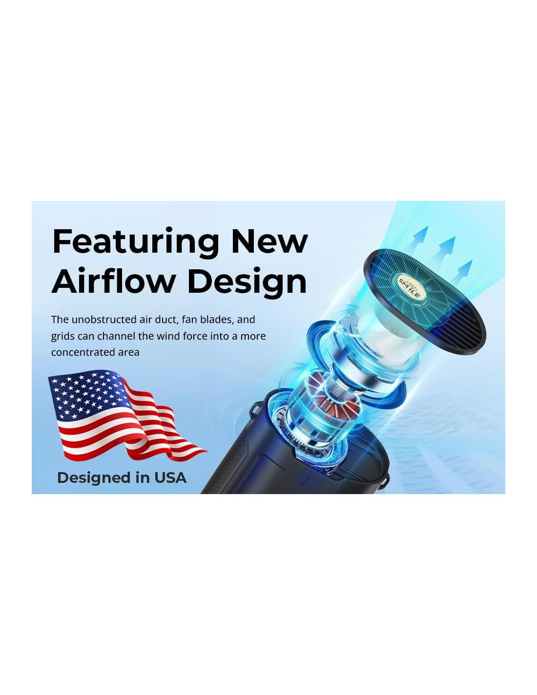 - Flujo de Aire de 4 Velocidades: Velocidades ajustables desde una suave brisa hasta un potente soplo con un ventilador turbo de 5 aspas que gira hasta 6600 RPM.