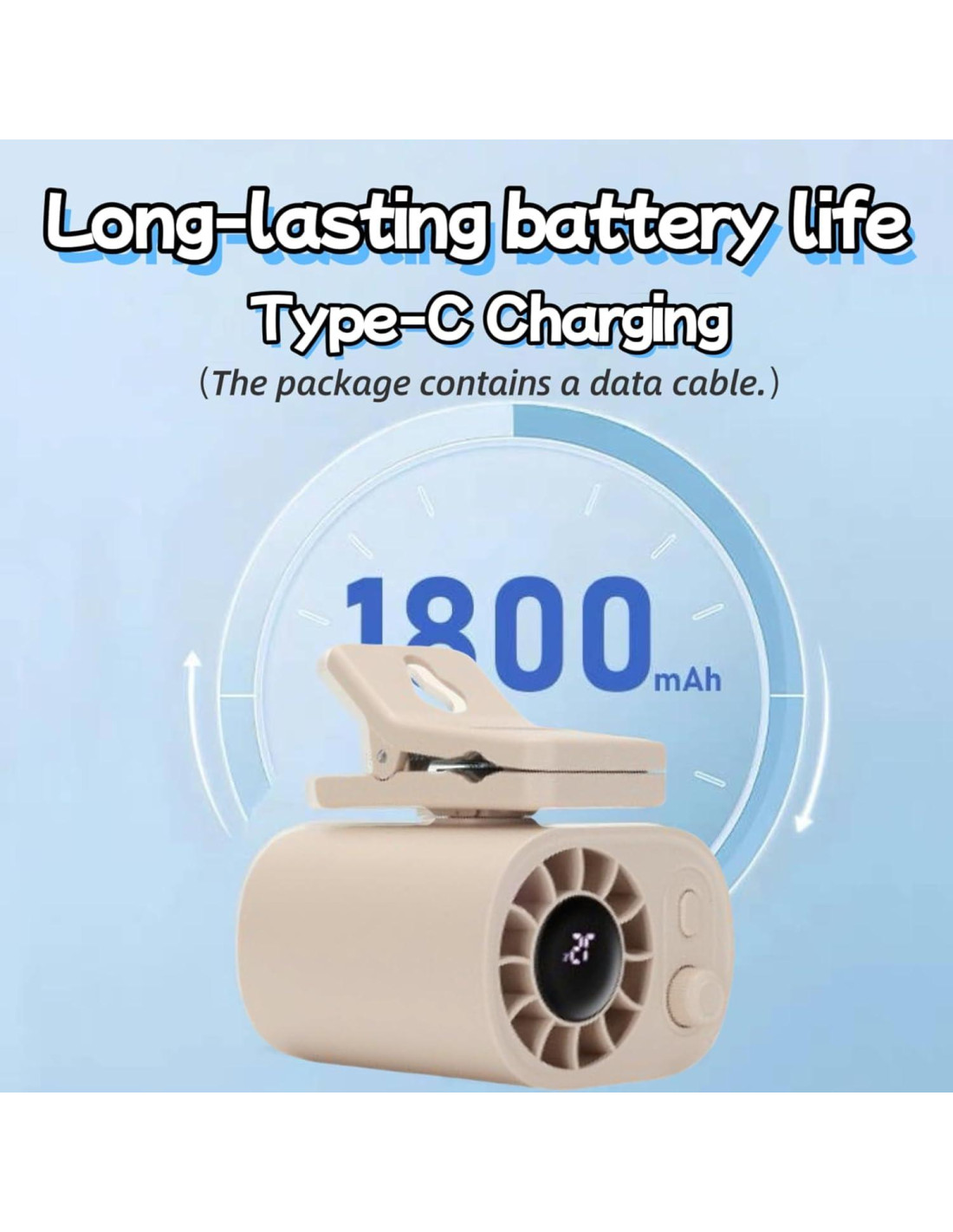 - [Gestión Inteligente de Energía & Recargable Tipo-C] Batería de 1800mAh ajusta inteligentemente el consumo: - 1-50 velocidad: 8-24 horas de duración, 51-100 velocidad: 3-6 horas; El ventilador personal es recargable por USB, viene con un cable de carga, puedes cargarlo desde un enchufe regular, computadora o cualquier otro dispositivo a través de un puerto USB.