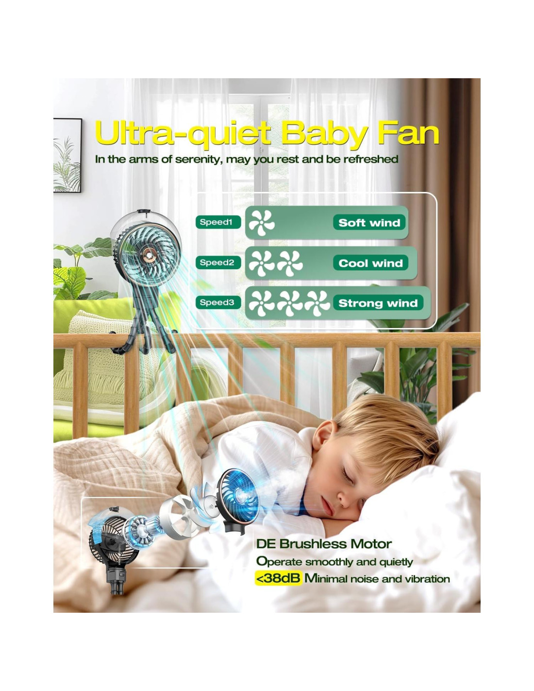 - [Viento Fuerte y Bajo Ruido] El ventilador de cochecito para bebé utiliza un diseño único de motor sin escobillas de bajo ruido que proporciona a las personas un fuerte flujo de aire mientras reduce el ruido en un 25%. Nuestro ventilador de nebulización para cochecito utiliza una operación de un solo botón para cambiar entre 3 velocidades de viento. El motor de bajo ruido es adecuado para tu oficina tranquila o lectura, y perfecto para que tus hijos duerman cómodamente.