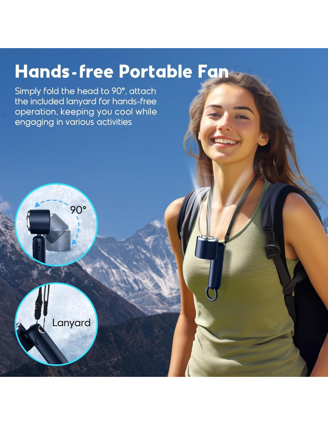 - [Enfriamiento Instantáneo] Diseñado con una estructura de turbina, motor potente y tecnología de semiconductores, nuestro ventilador circula y enfría el aire rápidamente, entregando aire frío refrescante al instante. Su elegante diseño cilíndrico, fabricado con un gancho plegable, asegura un agarre cómodo para un uso prolongado. Despliega la cabeza a 90 para un ventilador de mano, o despliega el gancho del ventilador a 90 para un ventilador de mesa. Simplemente pliega la cabeza a 90, coloca la correa y se convierte en un ventilador portátil alrededor de tu cuello y cara.