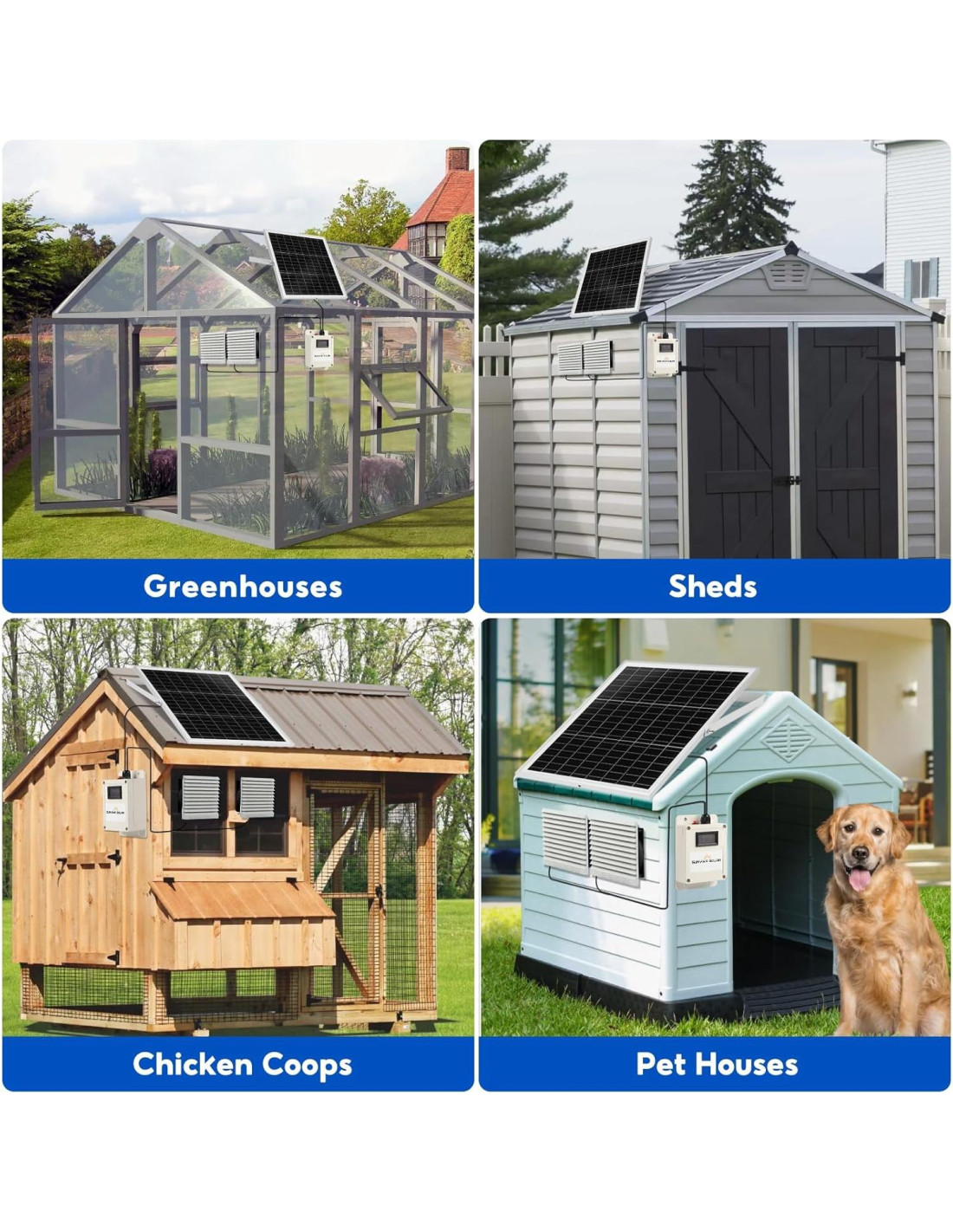 - [Amplia Aplicación] : Fácil de instalar, soporta una variedad de métodos de instalación, solo conecta el panel solar al ventilador y colócalo a la luz solar para usar. El ventilador de escape doble de alto rendimiento ventila bien y se utiliza ampliamente en invernaderos al aire libre, gallineros, casas para mascotas, cobertizos, áticos y escenarios de ventilación de ventanas.