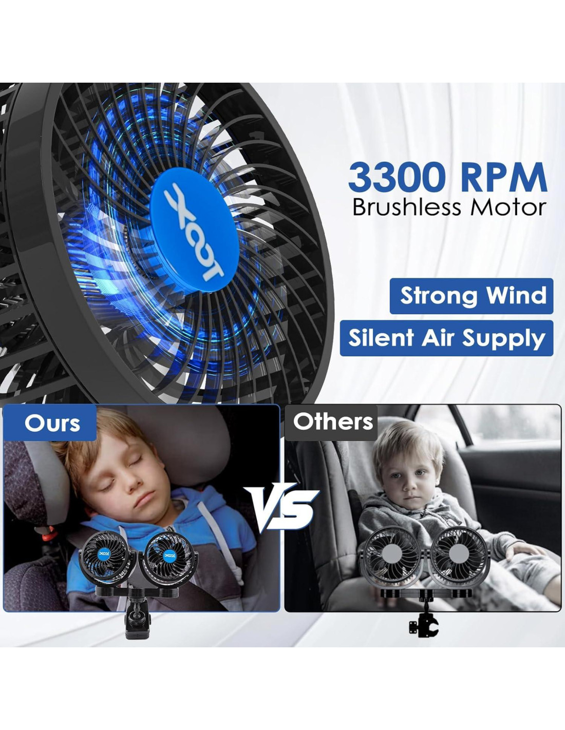 - Viento Fuerte: Ventilador de enfriamiento de vehículo con rotación de ventilador altamente eficiente, trae frescura a los pasajeros y bebés o mascotas en cada rincón del asiento trasero del coche.