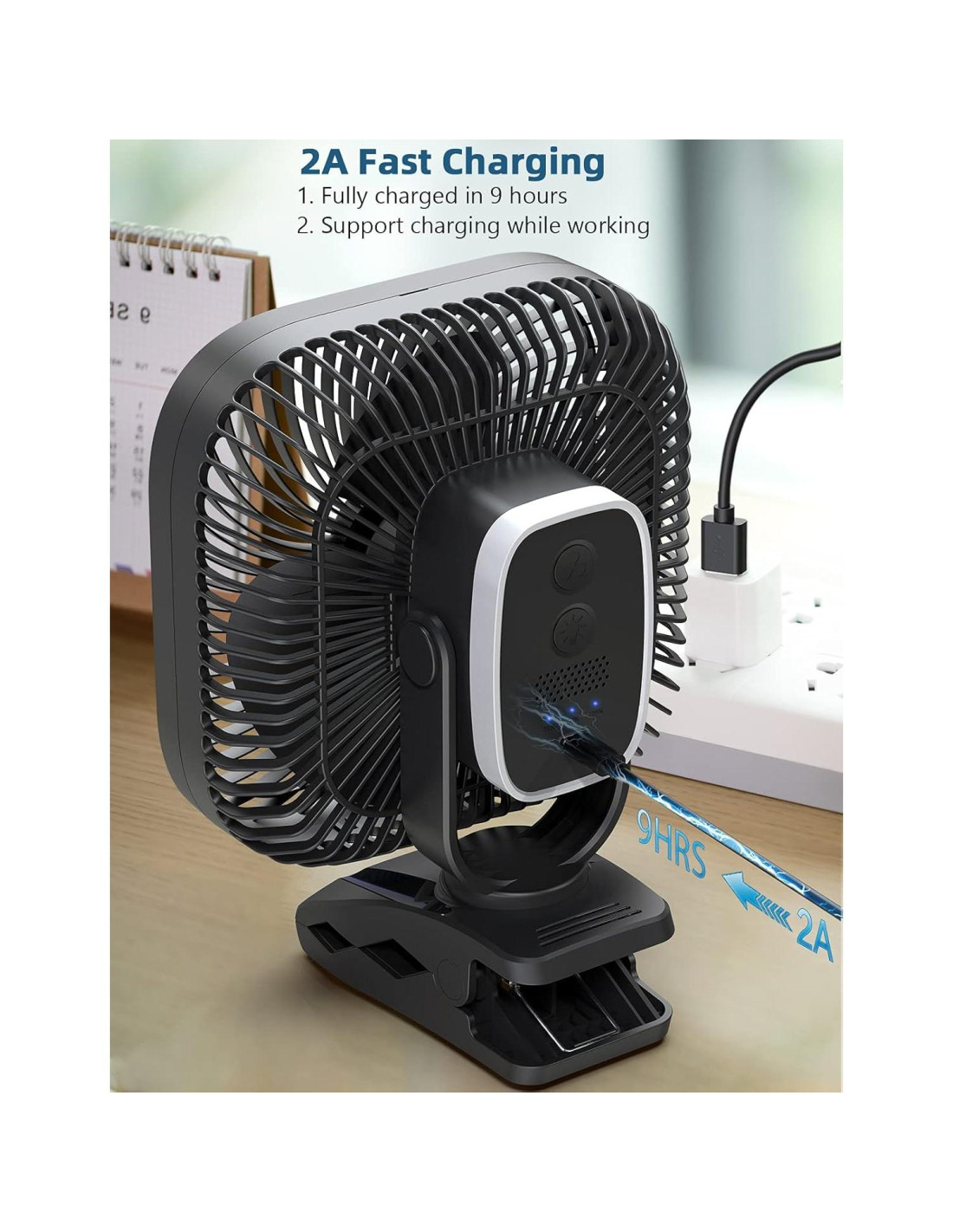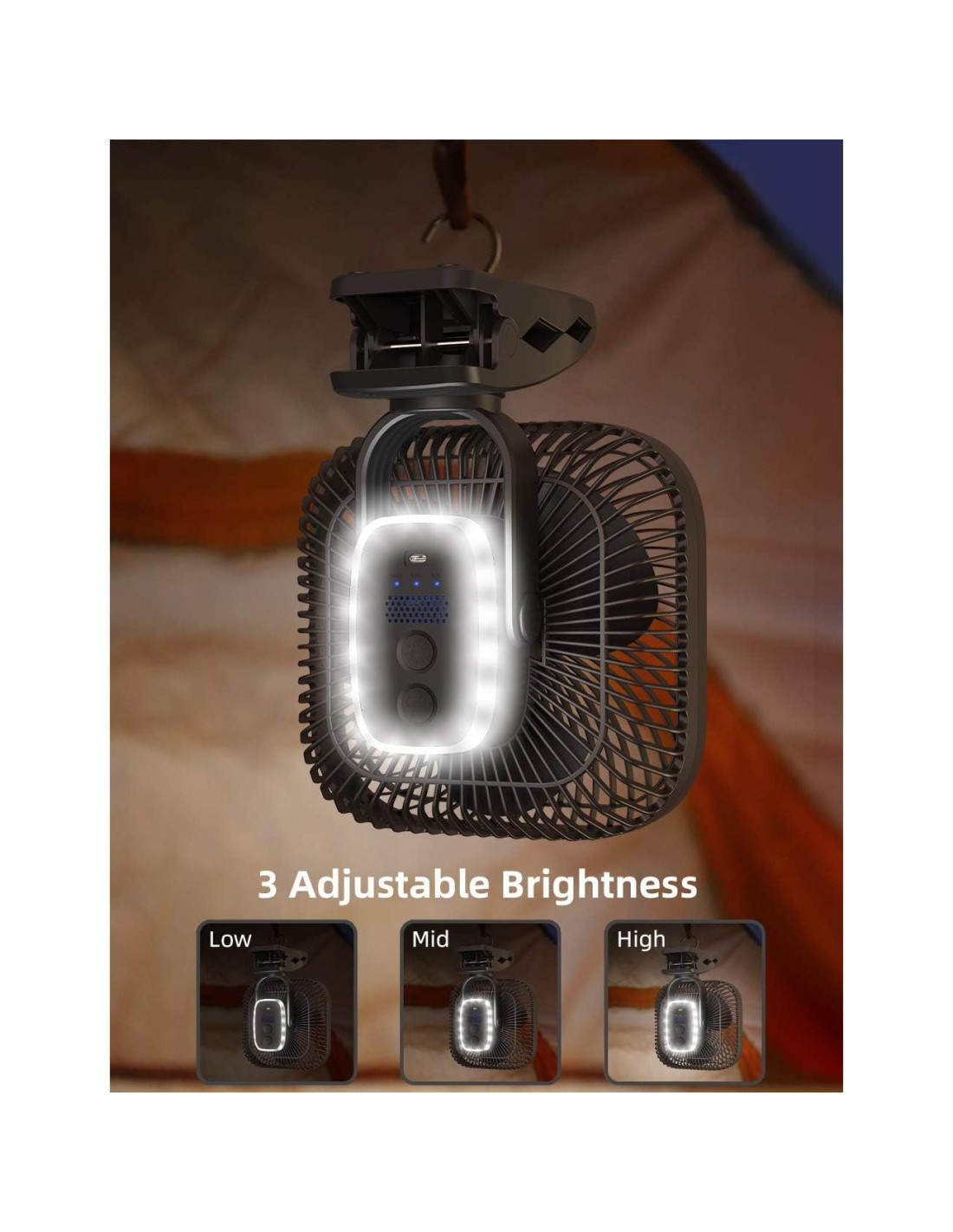 - [Diseño de Gancho] Este ventilador de camping tiene un gancho incorporado, puede colgarlo en las tiendas, ramas o dentro de un coche. También puede colocarlo simplemente en un escritorio en casa o en la oficina. También tiene un clip resistente con el que puede sujetar el ventilador a cintas de correr, cochecito de niño, paraguas de camping al aire libre, o incluso carro de golf.