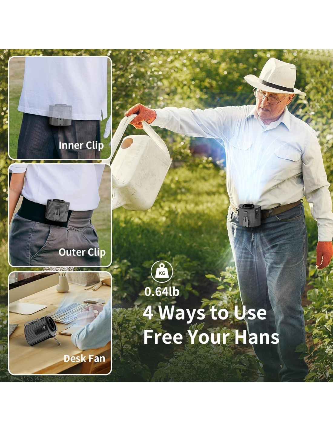 - Clip de Acero Manganeso Resistente: Nuestro ventilador portátil mini con clip en la cintura está diseñado para varios escenarios de uso al aire libre, atendiendo a ocupaciones como trabajadores y agricultores. El clip de acero manganeso mejorado proporciona una fuerza de agarre más fuerte, manteniendo siempre el ventilador portátil firmemente, y es más duradero. Diseño práctico con dos clips en direcciones opuestas permite más opciones de colocación.