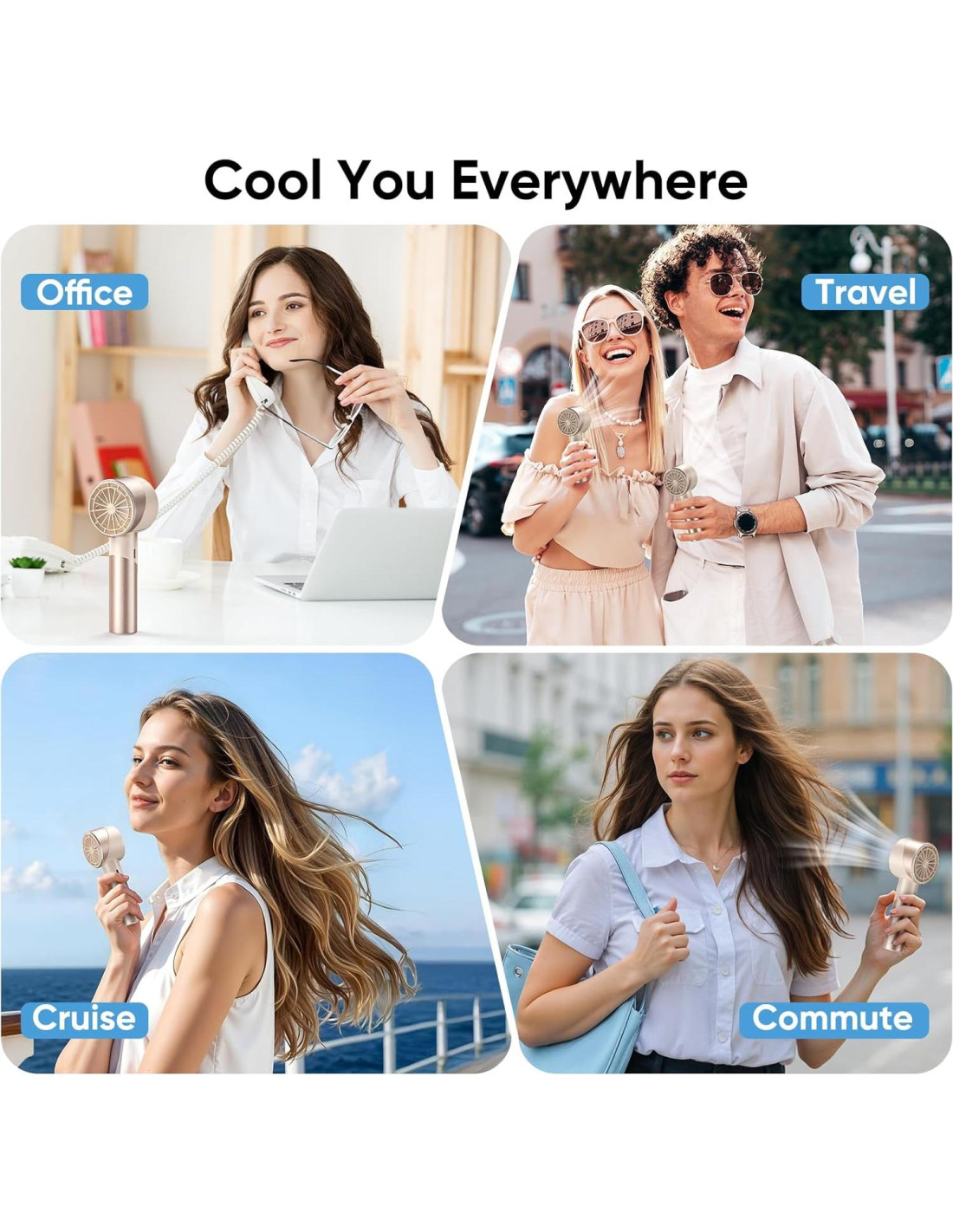 - Ventilador de Mano/Escritorio: Nuestros diseñadores han hecho un buen trabajo equilibrando el peso del ventilador mini y la vibración de las aspas, el ventilador recargable puede mantenerse de pie independientemente como un ventilador de escritorio sin una base adicional, liberando tus manos cuando estás ocupado en el trabajo/en la oficina y este ventilador de viaje funciona en silencio (30 db), no te molesta en absoluto