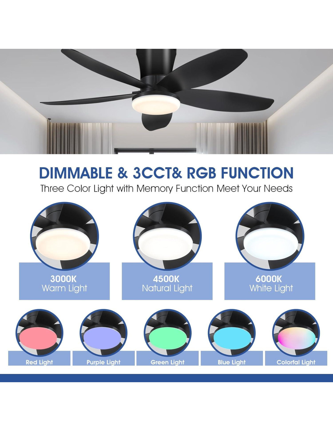 - [Ventilador de Techo con Control APP/Remoto] : Disfruta de la comodidad del control remoto y el control APP, fácil de operar. Ajusta 6 tipos de velocidad del viento, 7 luces RGB de colores y brillo, dirección positiva y reversible, temporizador de 2/4 horas.