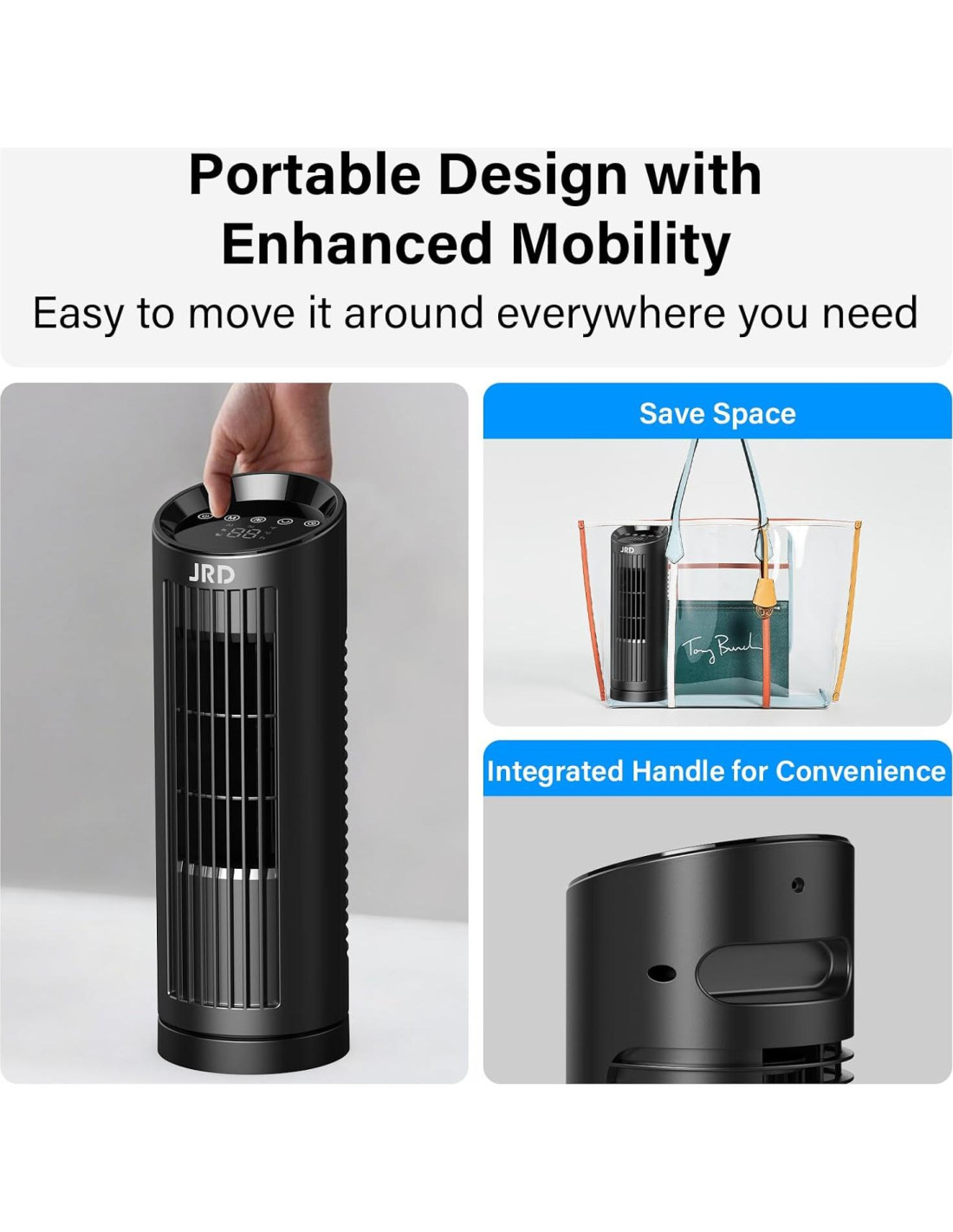 - Diseño Compacto y Ligero: A pesar de sus dimensiones compactas y construcción ligera, este ventilador mantiene un alto rendimiento y funcionalidad. Con una altura de solo 13 pulgadas (33 cm), sirve como una solución ideal para ahorrar espacio e incluye un mango incorporado para fácil portabilidad. Se puede colocar convenientemente en pisos, escritorios, mesas o tocadores.