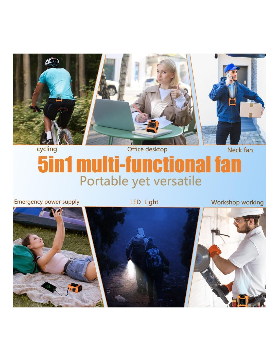 - [Diseño Estructural de Alta Resistencia con Cubierta Protectora de Silicona para Protección contra Caídas] : Como ventilador para actividades al aire libre, las caídas ocasionales son inevitables. Nuestro ventilador cuenta con una carcasa de plástico de alta resistencia y durabilidad, complementada por una cubierta protectora de silicona ultra gruesa diseñada específicamente para soportar impactos. Puede soportar caídas aleatorias desde una altura de 2 metros hasta 100 veces, asegurando que el ventilador continúe funcionando normalmente