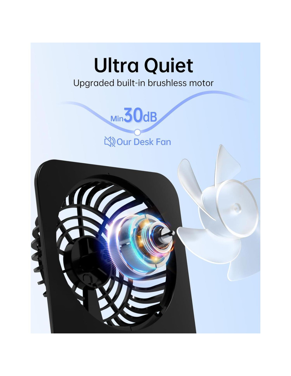 - Ultra Silencioso - Este ventilador de escritorio mini está equipado con un motor sin escobillas, asegurando un funcionamiento extremadamente silencioso. Con un nivel de ruido mínimo de solo 25db, no interrumpirá tu trabajo o sueño. Puedes disfrutar de un ambiente pacífico mientras te mantienes fresco