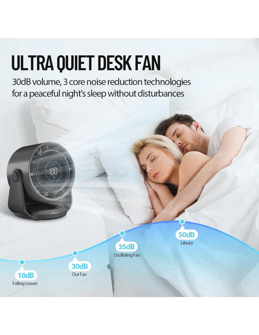 - Ventilador de Escritorio Ultra Silencioso: Si buscas un ventilador de escritorio silencioso para disfrutar de aire fresco mientras duermes, este ventilador de escritorio será una gran opción para ti. En modo nocturno, salida de ruido ultra bajo de 25dB, perfecto para dormitorios y personas con sueño ligero