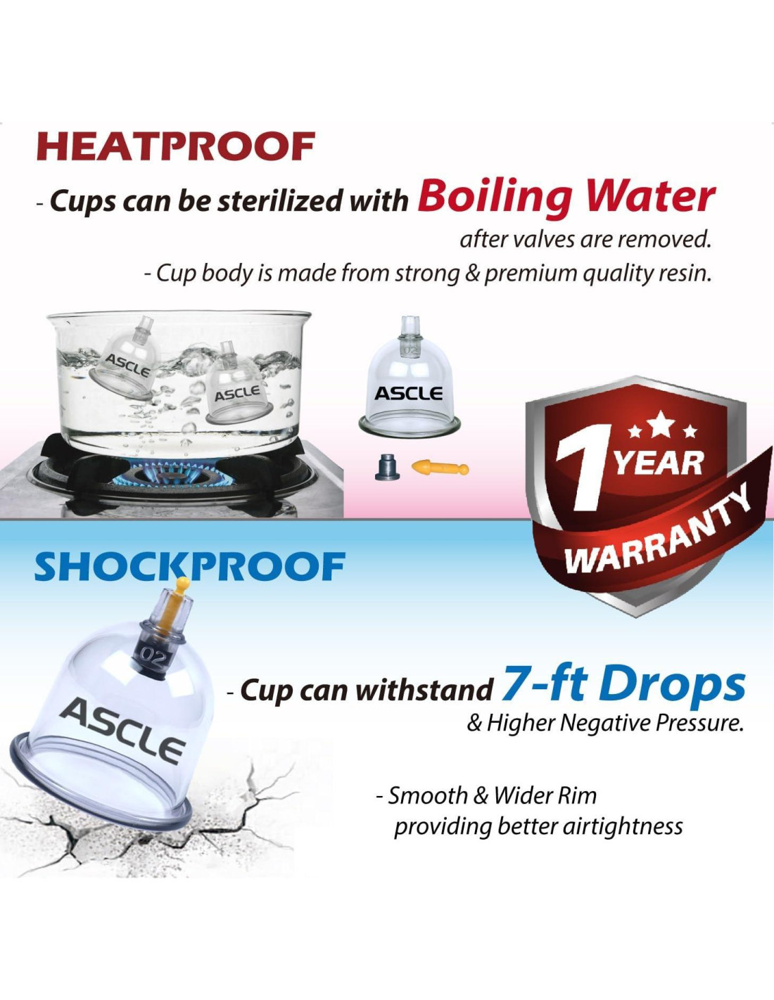 - [Tazas a Prueba de Golpes y Calor] El juego de ventosas ASCLE es uno de los kits de ventosas más utilizados y recomendados para terapeutas de masaje, spas, entrenadores atléticos, atletas de élite y otros profesionales. Las tazas de ventosas SUPER premium están hechas de materiales más resistentes - pueden soportar caídas de al menos 2.1 metros y una presión negativa mayor. El borde de la taza más ancho y suave proporciona una mayor área de contacto con la piel y mejor hermeticidad