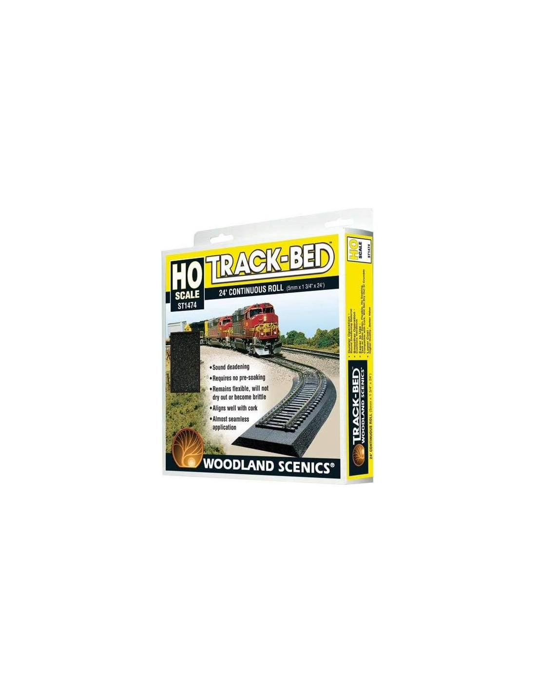 El Track-Bed de Woodland Scenics ofrece estas ventajas: Operación más silenciosa (Material que reduce el sonido), Operación más suave (Amortigua las vibraciones), Más fácil de usar (Se puede pegar o encolar, Flexible, No requiere remojo, Compatible con corcho, No se seca ni se desmorona), y un mejor valor (Mayor calidad... Menor costo). Este rollo continuo de tiras de Track-Bed a escala HO tiene un grosor de 5 mm x 24 pies (7.32 m) de largo.