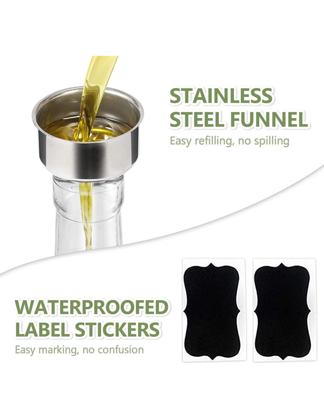 - Pico de acero inoxidable multifuncional. La botella de aceite de oliva tiene picos vertedores de acero inoxidable 18/8 que mantienen el polvo fuera. Todos pueden verter y dispensar aceite con un buen chorro sin fugas. Apta para lavavajillas e intercambiable.