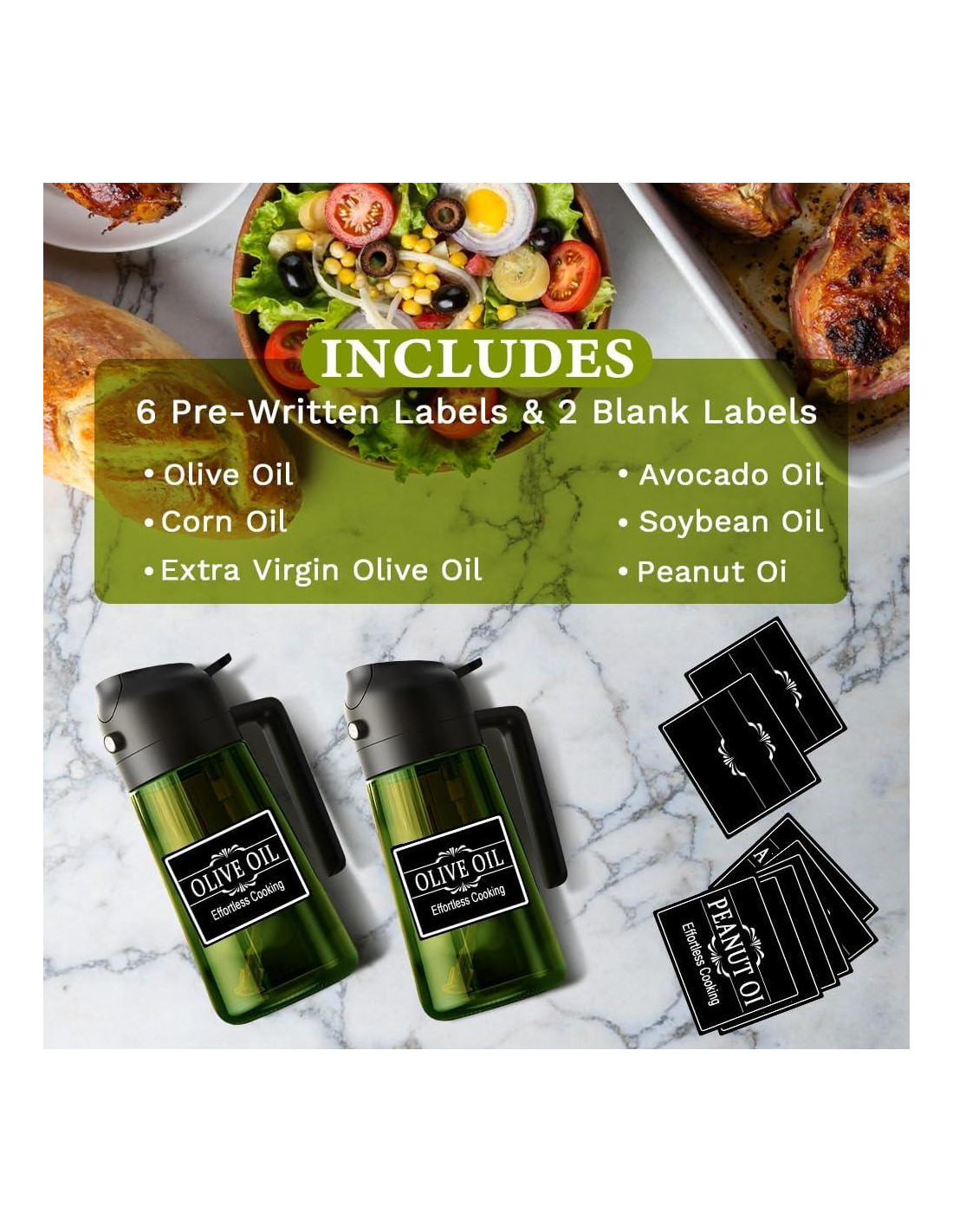 - Etiquetas elegantes y prácticas - Incluye 8 etiquetas impermeables: 6 preimpresas y 2 en blanco. Organiza fácilmente diferentes aceites y salsas mientras añades un toque limpio y moderno a tu cocina.