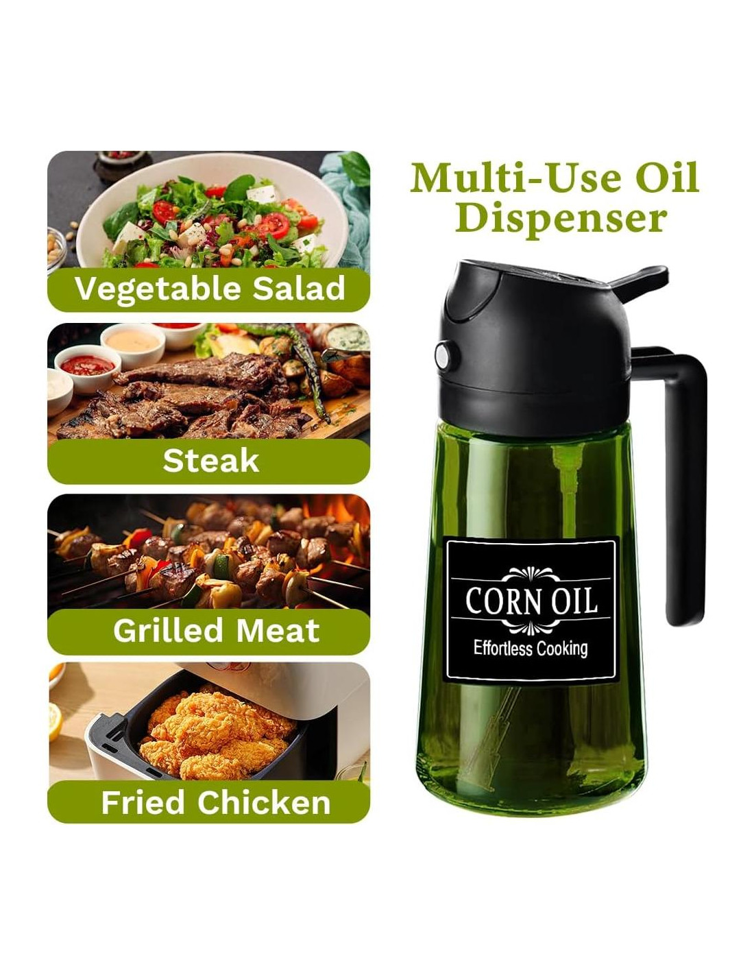 - Diseño multifuncional 2 en 1: Solo presiona para rociar, desliza el interruptor para verter aceite, una botella para uso dual, para satisfacer las necesidades de aderezo de ensaladas, freír, asar, hornear y otras necesidades de cocina. Control preciso del aceite, fácil de crear una vida saludable y deliciosa.