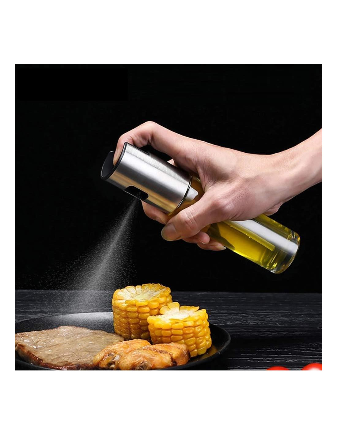 - ROCIADOR SALUDABLE - El rociador de aceite para freidora de aire está hecho de acero inoxidable 304 de primera calidad y botella de vidrio de grado alimenticio. Se adapta a personas que desean controlar el aceite al cocinar. Llénalo con tu aceite favorito y sal a asar.