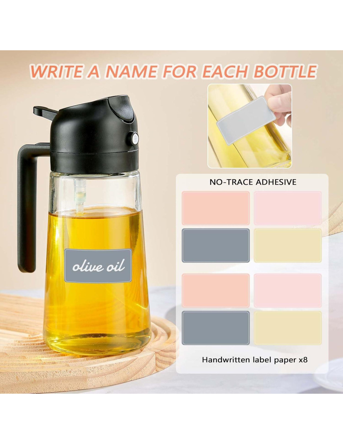 - SOBRE EL PAPEL DE ETIQUETAS: Cada botella viene con 8 hojas adicionales de papel de etiquetas, puede personalizar el contenido en el papel de etiquetas y colocarlo en la botella de aceite en spray.