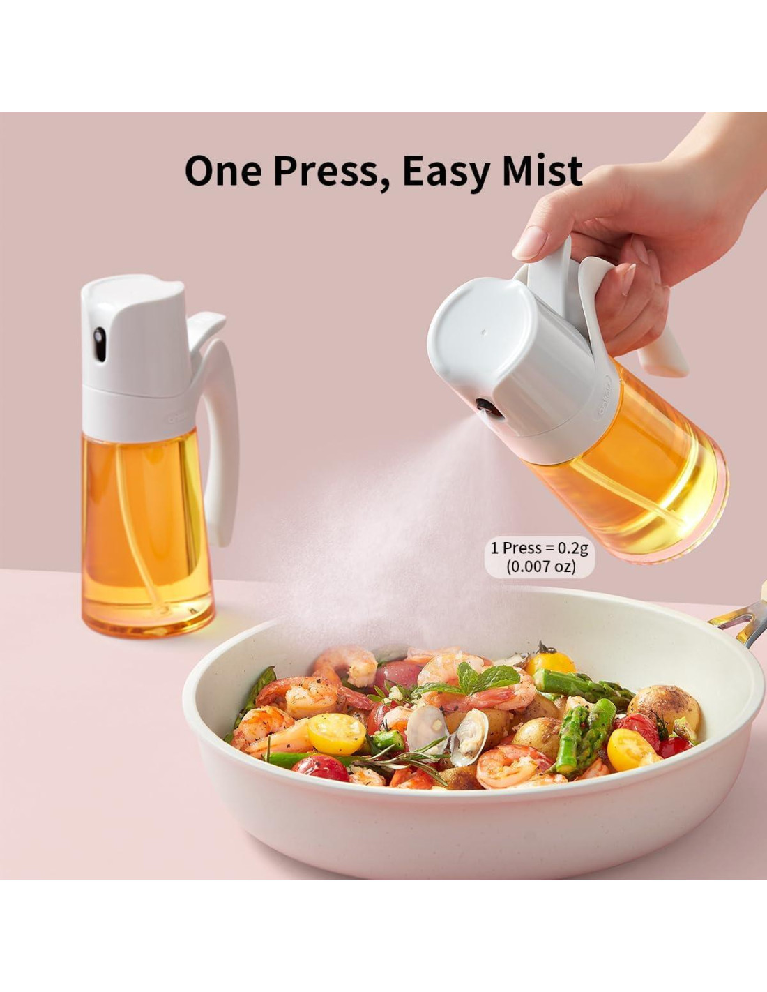 - Distribución de Aceite Eficiente La botella de spray de 300ml se convertirá rápidamente en uno de los gadgets más utilizados en tu cocina. Es perfecta para rociar uniformemente una capa delgada de aceite en tu freidora de aire, plancha para waffles o cualquier utensilio de cocina. Simplemente presiona la bomba con tu pulgar para liberar una fina neblina, cada presión dispensa aproximadamente 0.2 gramos de aceite, asegurando la cantidad justa de aceite para un acabado crujiente y dorado, sin preocuparte por empapar tu comida y hacerla blanda o grasosa.