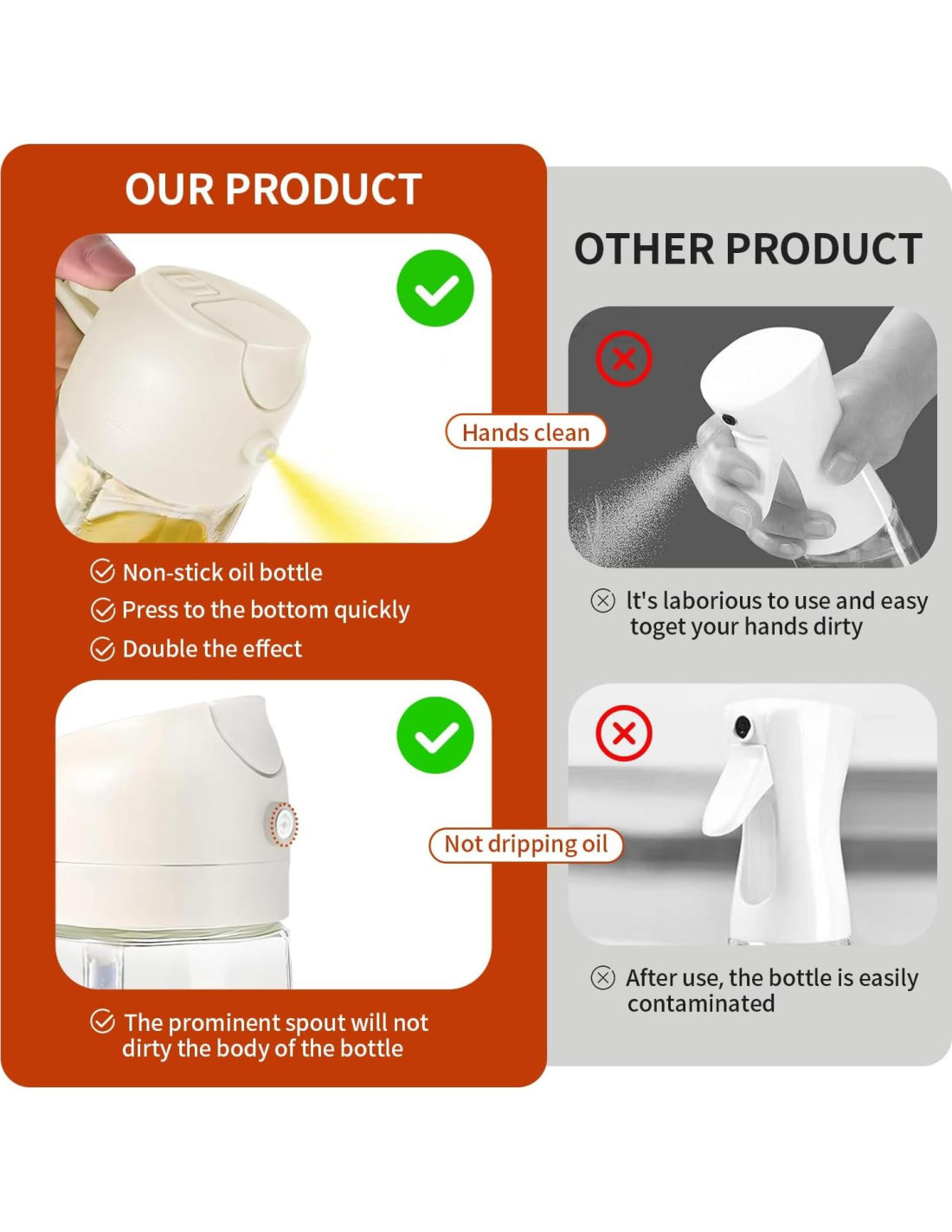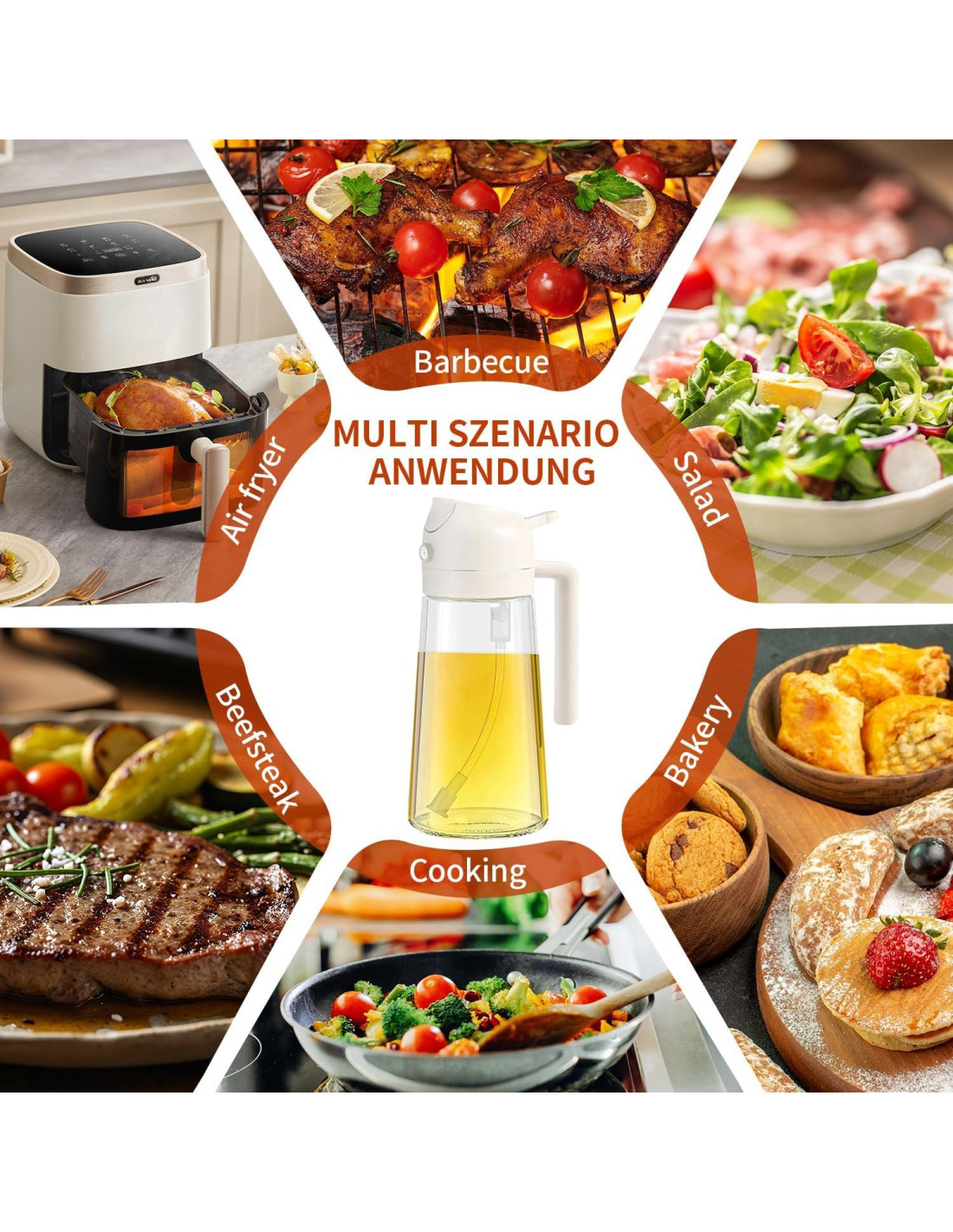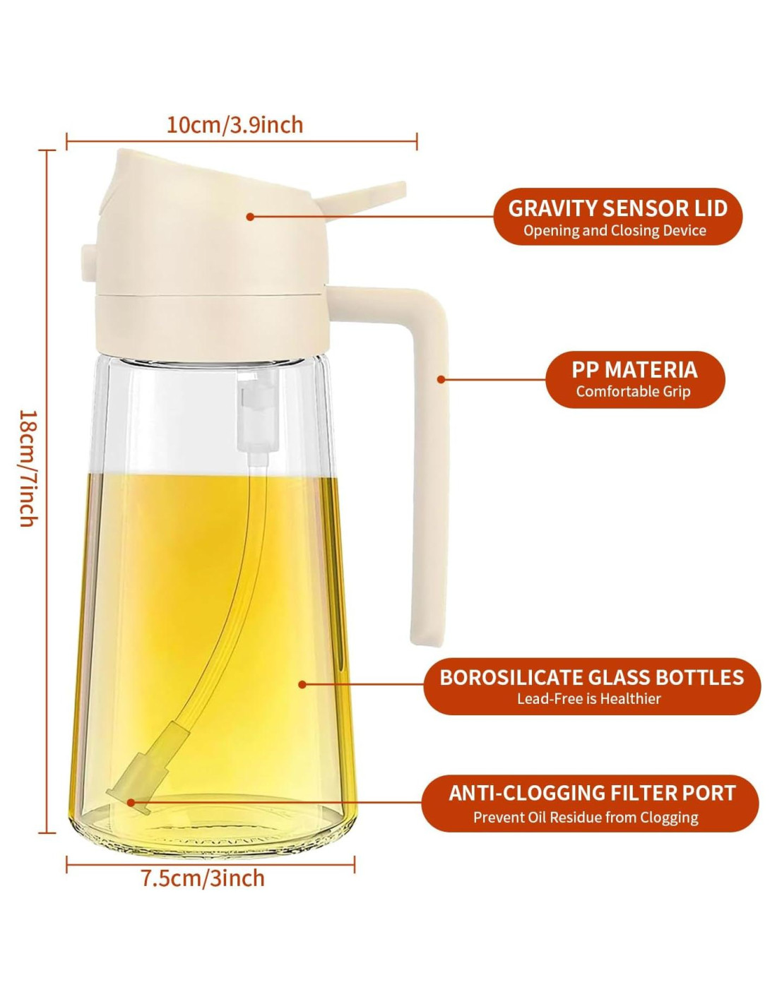 - Dispensador de Aceite 2 en 1 y Rociador de Aceite: Este dispensador de aceite 2 en 1 y rociador de aceite ofrece tanto capacidades de vertido como de rociado, sirviendo como botella dispensadora de aceite de oliva y rociador de aceite para cocinar. Cambia sin esfuerzo entre verter aceite y rociar una fina niebla con un simple ajuste, mejorando tu experiencia culinaria con facilidad y eficiencia.