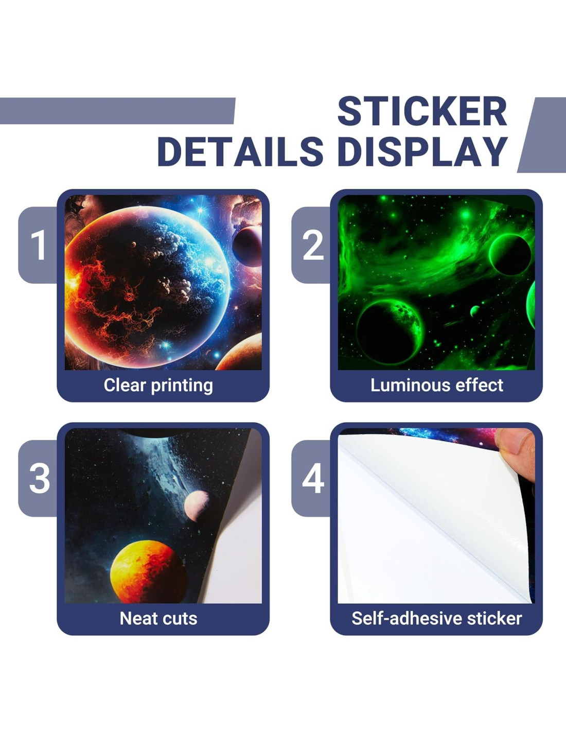- Material de Calidad Estas calcomanías de techo del universo están hechas de vinilo fluorescente NO TÓXICO, ECOLÓGICO, IMPERMEABLE y DURADERO. Brillan muy intensamente durante horas, pueden ayudar a tus hijos a superar su miedo a la oscuridad.