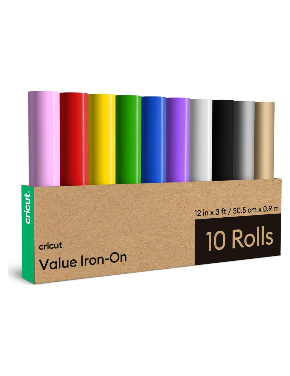 - INCLUYE - 10 rollos de Cricut Valor Plancha Vinilo de Transferencia de Calor - 30.5 cm x 0.91 m en Rosa, Rojo, Amarillo, Verde, Azul, Púrpura, Blanco, Negro, Plata, Oro