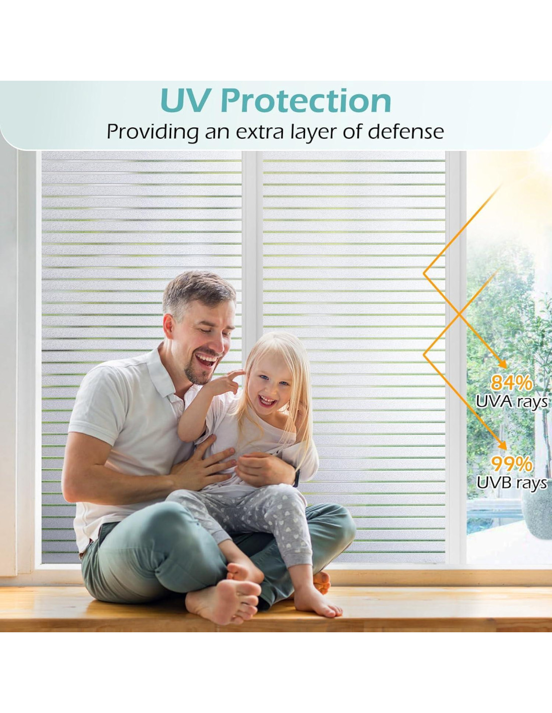- Protección Solar y Antideslumbrante: La película de privacidad de vidrio bloquea hasta el 84% de los rayos UVA y el 99% de los rayos UVB durante todo el día. Esta película de esmerilado para ventanas reduce efectivamente el deslumbramiento causado por la luz directa y protege tus ojos, piel y muebles interiores de la exposición excesiva al sol.