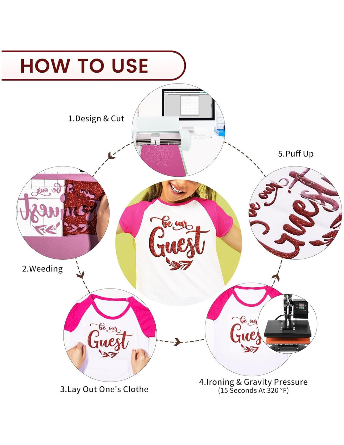 - A PRUEBA DE AGUA Y DURADERO - Con excelente elasticidad y suavidad, este nuevo vinilo HTV puff brillante está garantizado para mantener una buena adhesión y color vívido después de muchos lavados, sin descamación, sin pérdida de color, sin rotura, lo que lo convierte en la nueva opción ideal de vinilo de transferencia de calor