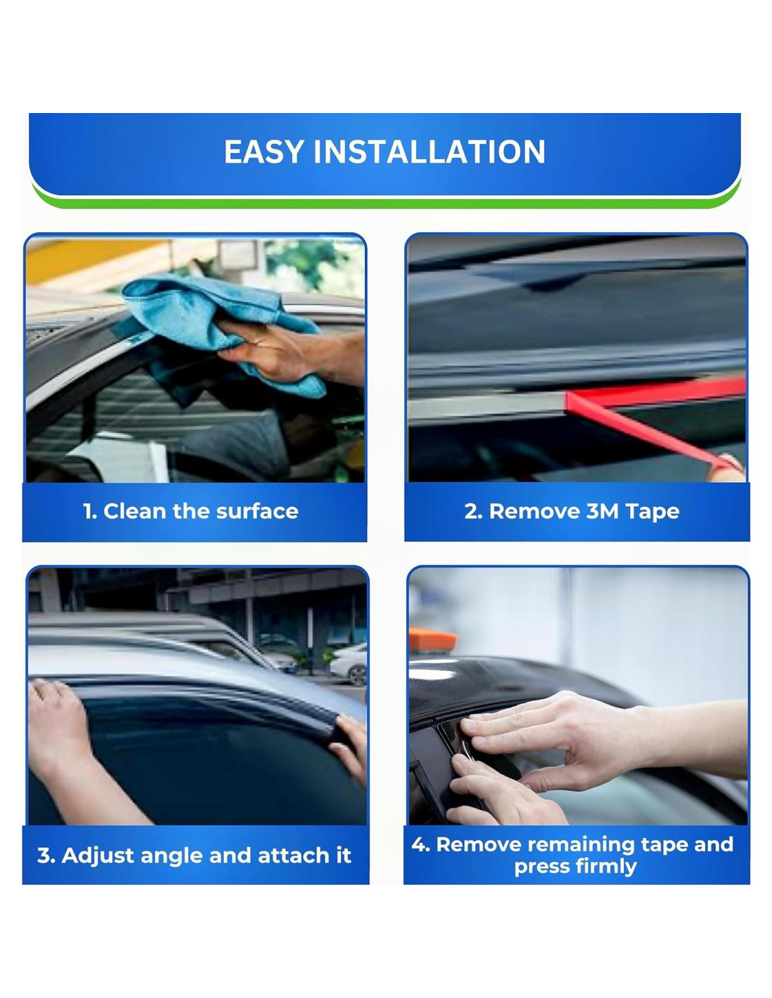 - Instalación Sencilla: la instalación es muy fácil y no se requieren perforaciones ni herramientas especiales. Prioriza una prueba de ajuste para las viseras antes de finalizar la fijación. [NOTA: Evita lavar tu coche durante las primeras 24 horas después de la instalación.]