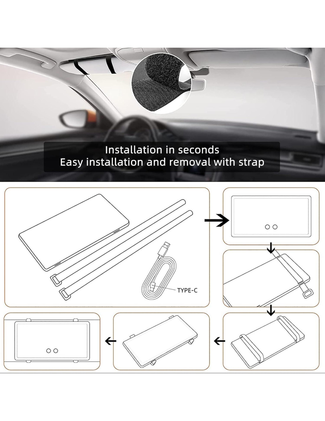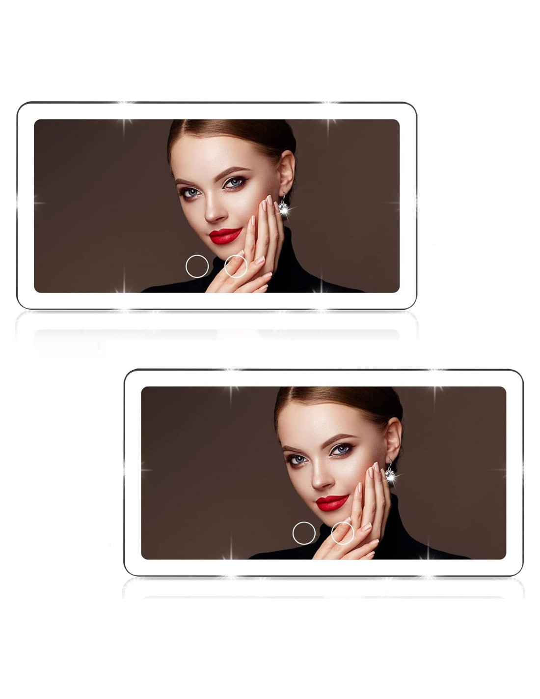 Espejo ordinario: luz deslumbrante, pequeño, brillo insuficiente, maquillaje pesado. Espejo Vanmirr: luz suave, grande, brillante y clara, casi luz diurna real. - Olvidaste traer tu espejo de tocador. - El interior del coche es demasiado oscuro y la luz no es suficiente. - Luz insuficiente en el espejo retrovisor del coche. - Demasiado alto y demasiado lejos. - Apresúrate a la fiesta, cita, trabajo, etc... - Preguntándote qué está haciendo el bebé y la mascota en el asiento trasero. - Viene con dos sensores táctiles. Presiona suavemente una vez para encender. - Cambia entre blanco frío o amarillo cálido con el sensor táctil. - Mantén presionado el botón para lograr el brillo ideal. - Tiene una función de memoria que recuerda la última configuración que usaste. - Indicador de carga: cuando el espejo de visera está cargando, la luz es roja, completamente cargado es luz azul. - Coloca la correa verticalmente en el espejo de visera del coche. - Asegura la correa en la visera del sol y ajusta. - Ajusta el espejo a la posición deseada. Regalo perfecto para tus seres queridos. El espejo de visera iluminado para coche viene con una caja de recuerdo elegante y hermosa, lo que lo convierte en el mejor regalo para tus mamás, novia, abuelas, etc.