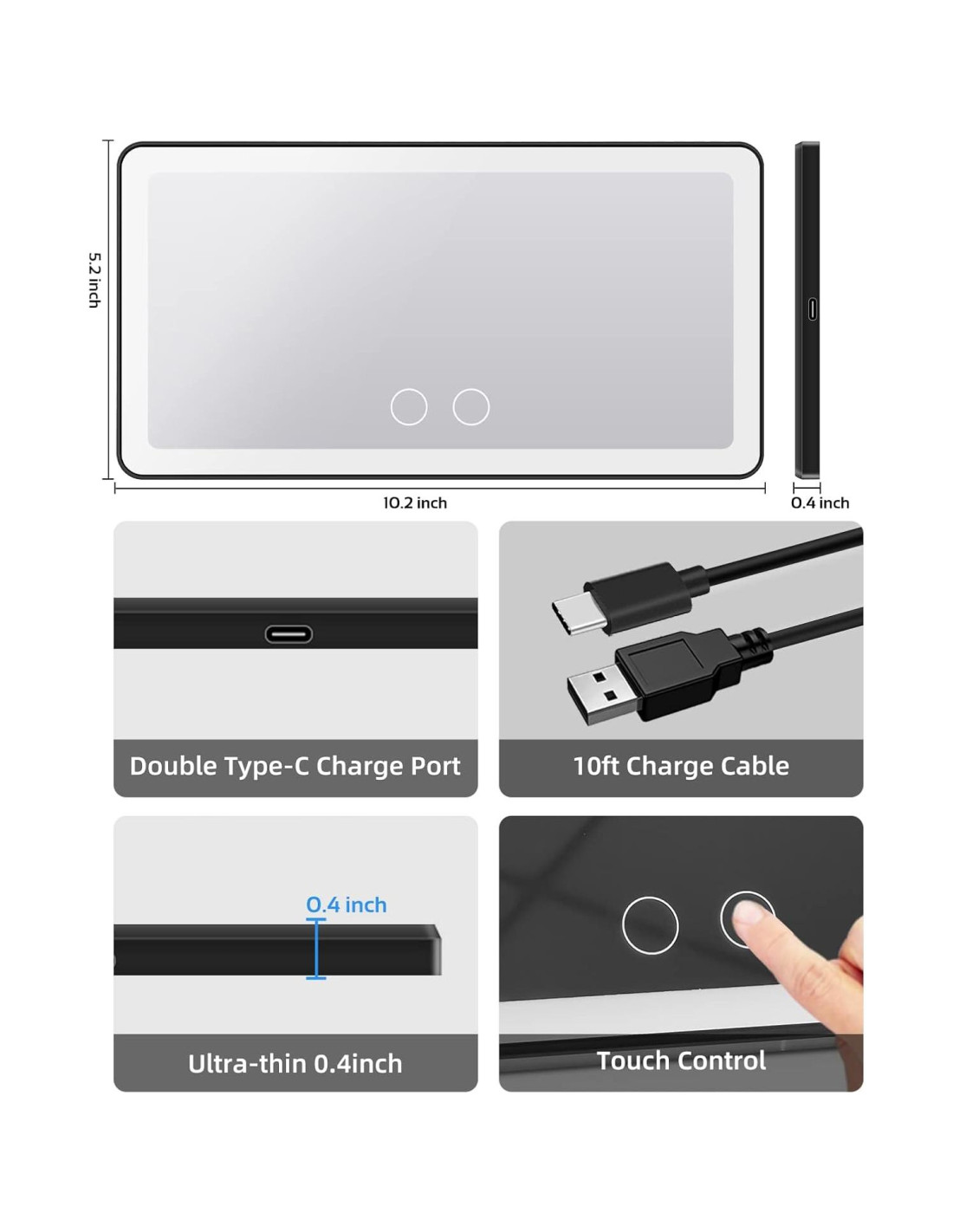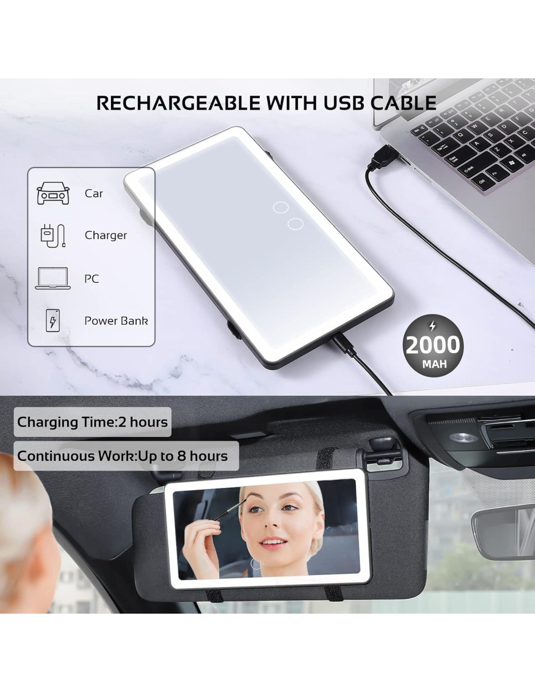 - Recargable por USB: Batería de litio de 2000 mAh incorporada, que se puede cargar a través del enchufe, computadora, batería móvil. Viene con un cable USB de 3 metros, libre para usar el espejo del coche en cualquier lugar y en cualquier momento. Puede durar 8 horas si está al 100% de brillo mientras está en modo siempre encendido.