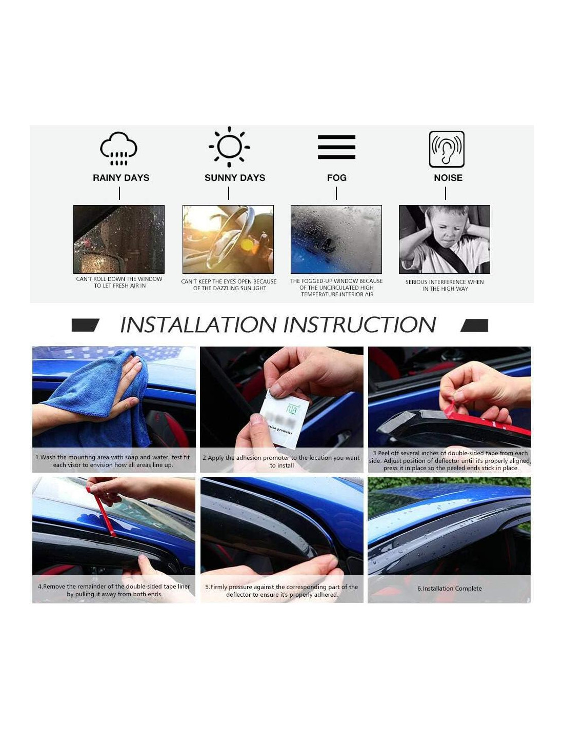 - Fácil de Instalar: Viene con un Set de 4 Piezas de Visores de Ventana y todo el hardware necesario. El diseño de Cinta en permite que la instalación se realice en menos de 10 minutos desde la comodidad de tu hogar. ¡Siempre que sigas correctamente nuestra guía de instalación, el parabrisas se puede adjuntar firmemente.
